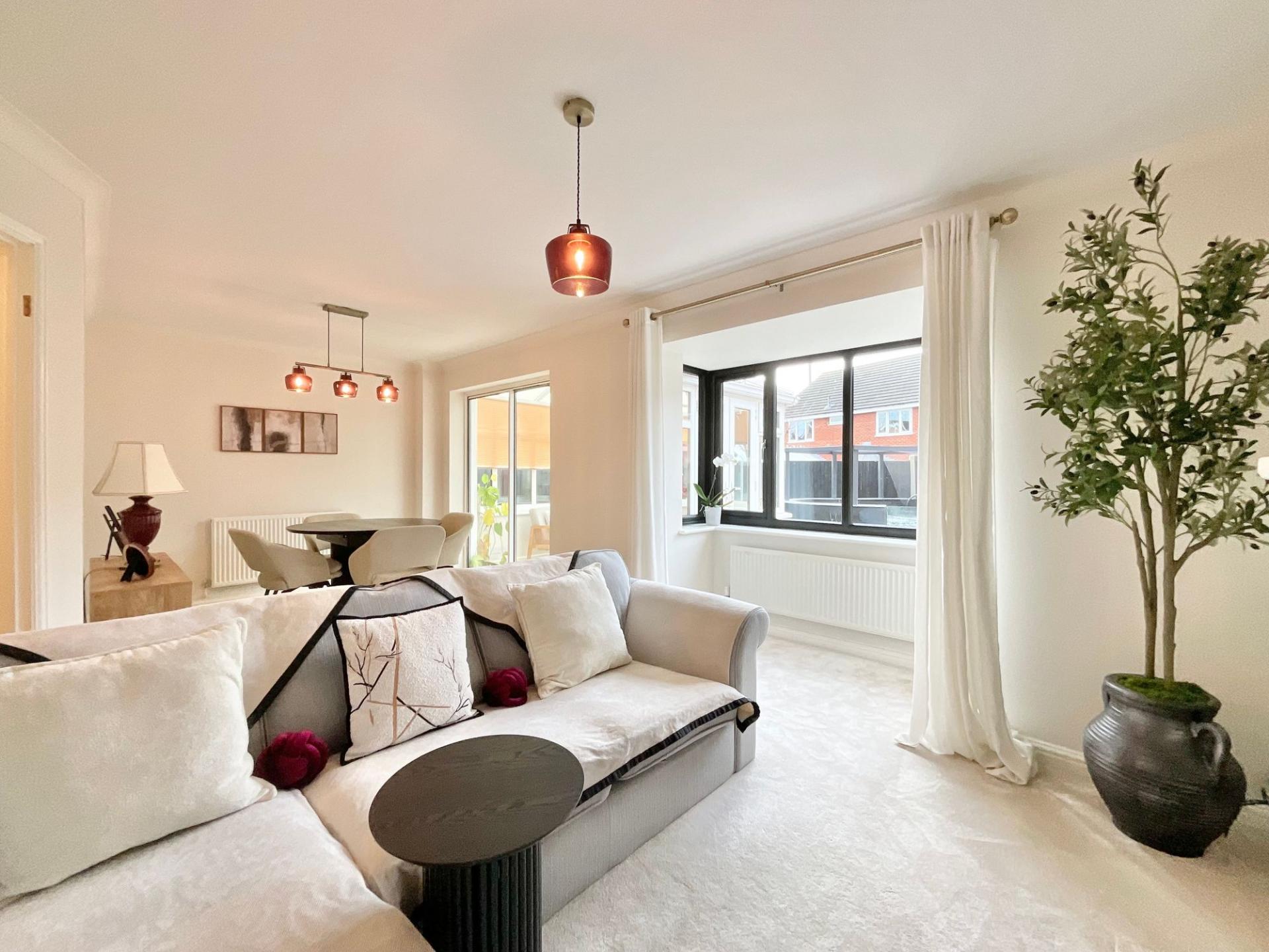 - Open-plan living/dining area plus garden-view conservatory. Bright, sociable living space with lovely garden outlook.