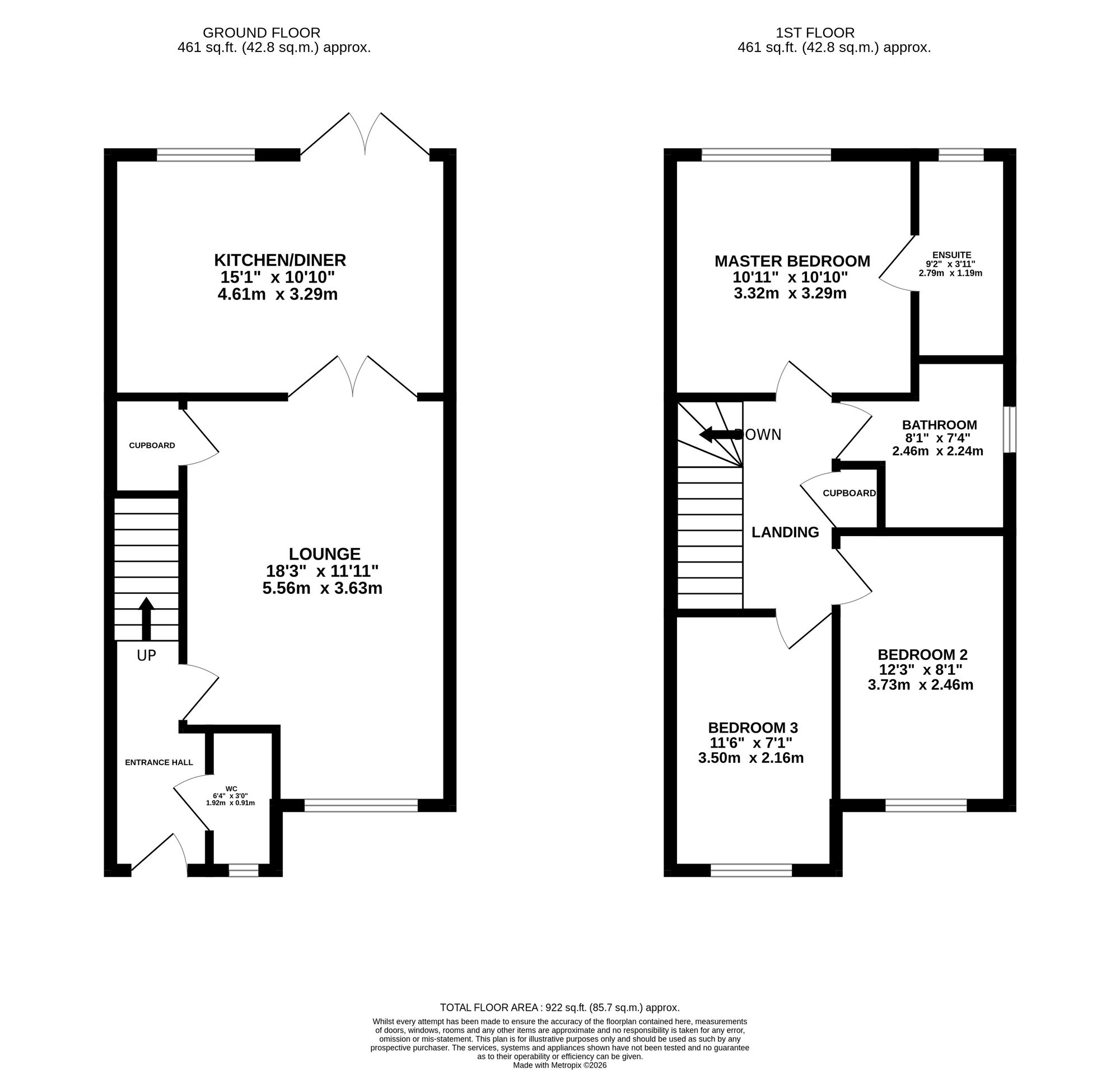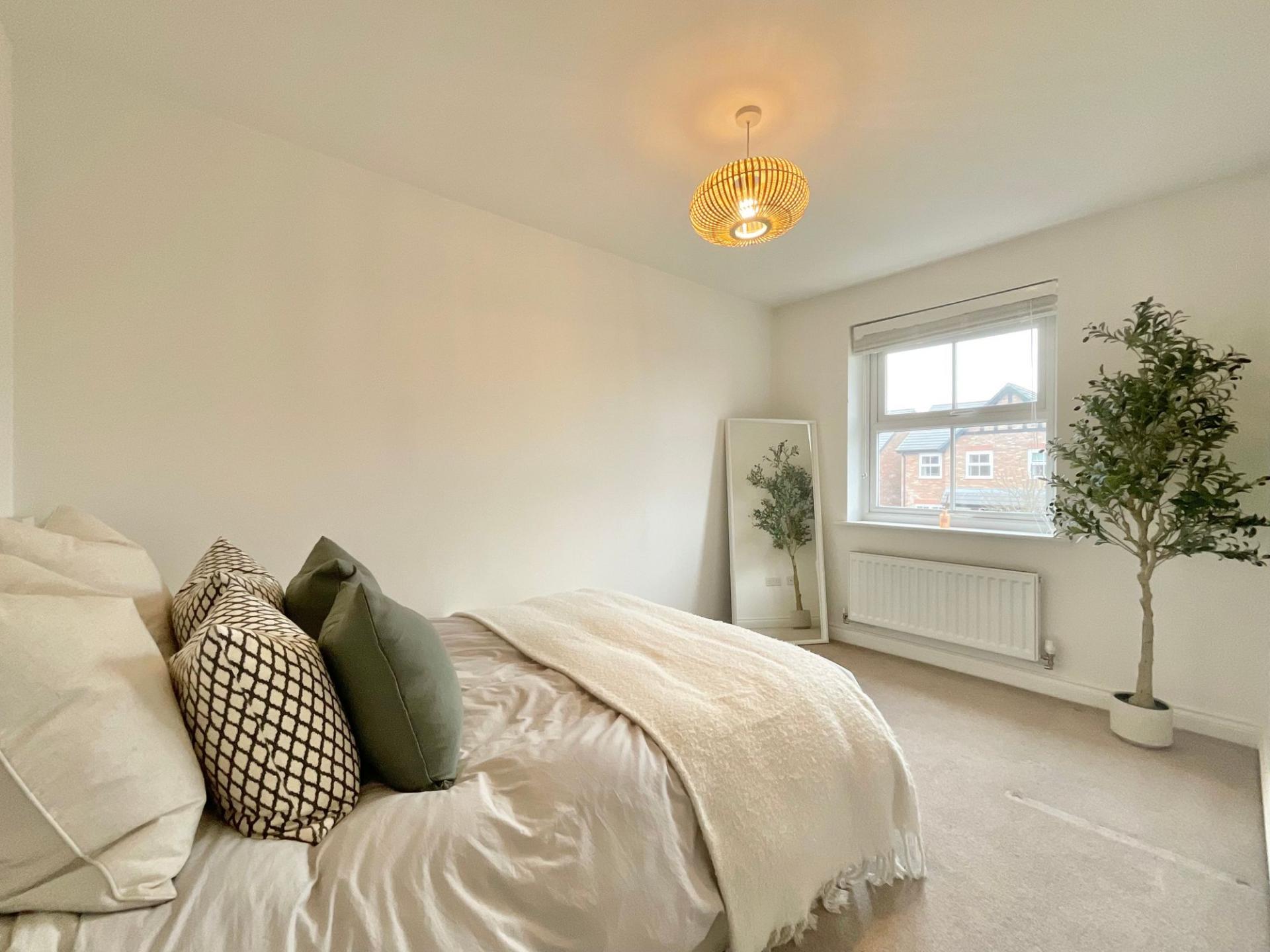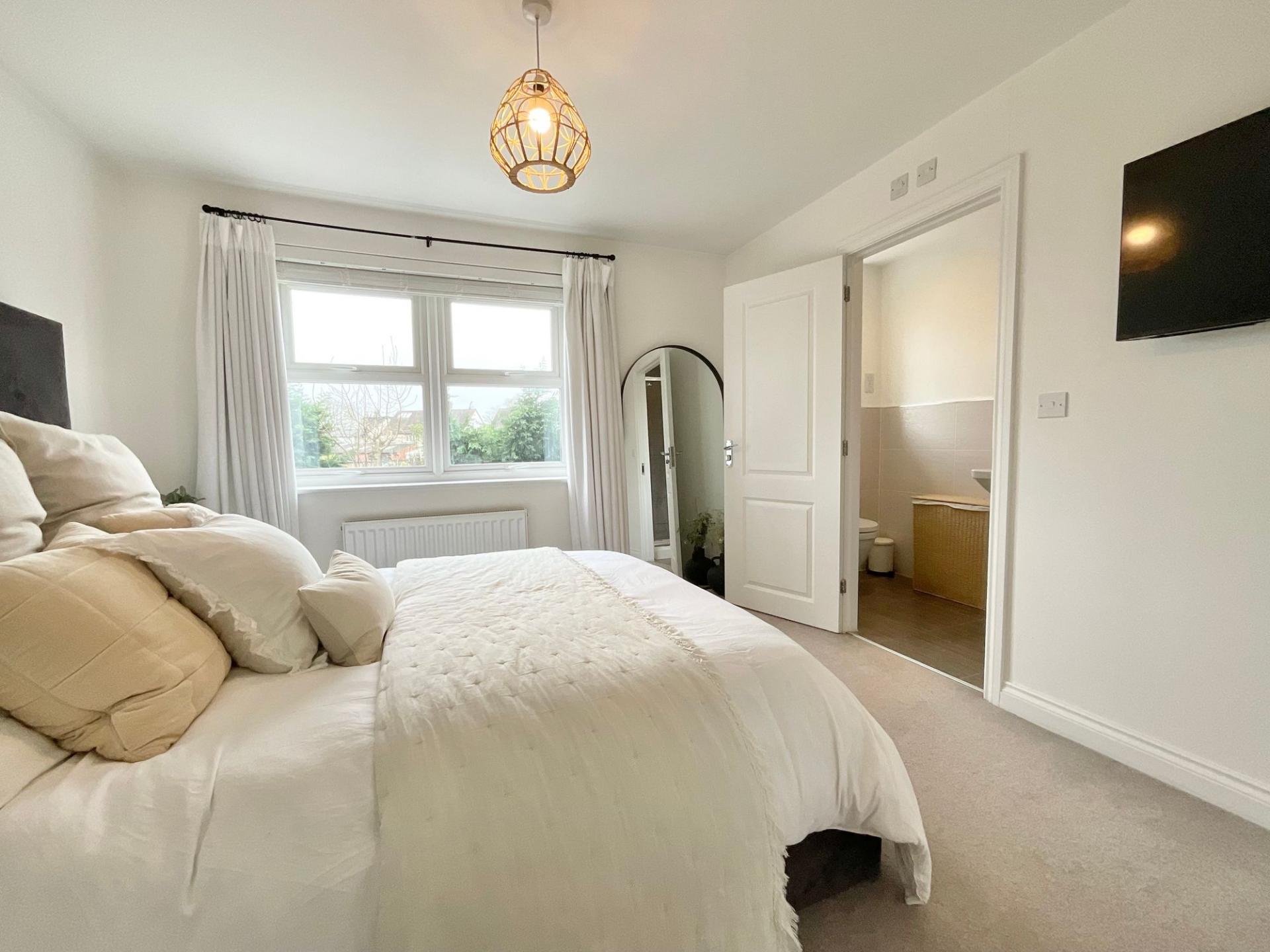 Upstairs, the property continues to impress with three well-proportioned bedrooms arranged around a central landing. The principal bedroom provides a comfortable and private retreat and benefits from its own modern en-suite shower room, complete with a walk-in shower. The second bedroom is also a generously sized double, offering excellent flexibility for use as a guest room, additional main bedroom, or workspace if desired.