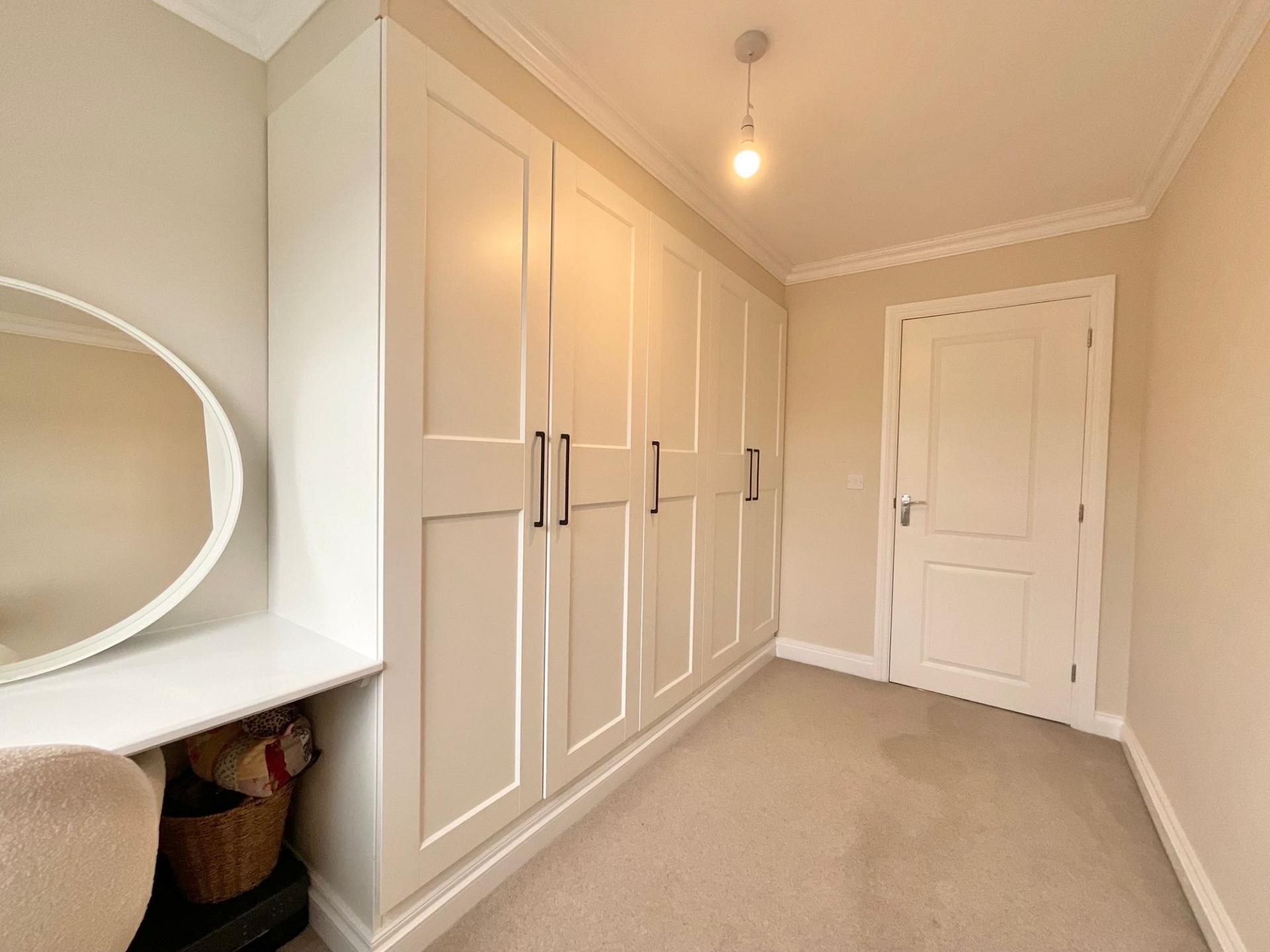 The third bedroom is currently arranged as a dressing room and benefits from built-in wardrobes stretching along one wall, providing excellent storage. This versatile space could easily be used as a bedroom, nursery, home office, or dressing room depending on a buyer’s needs.