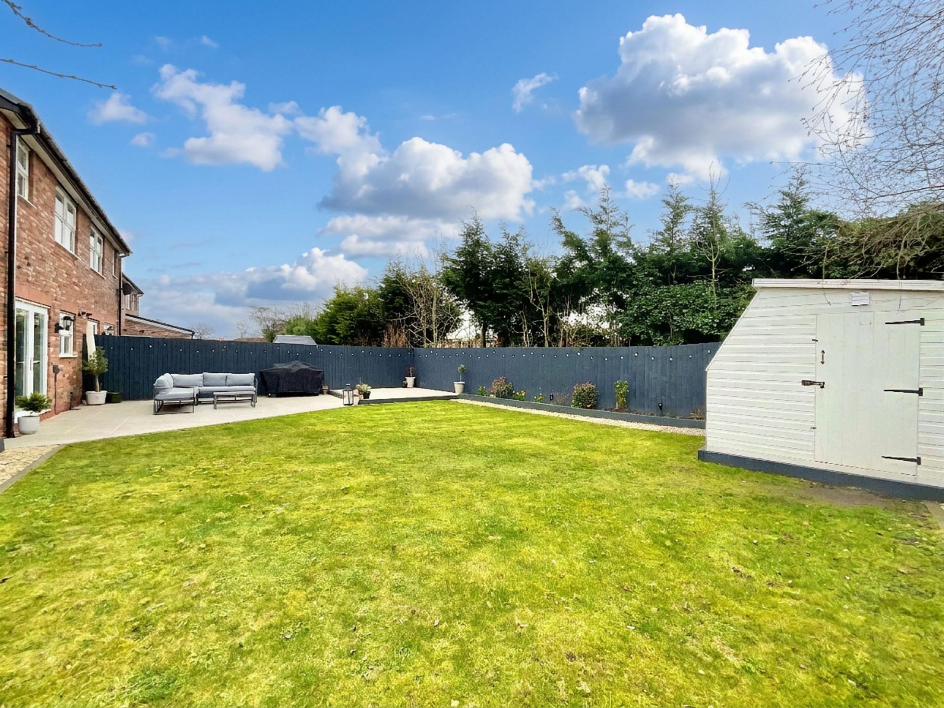 Externally, the property benefits from a well-maintained rear garden featuring a designated patio area, perfect for relaxing outdoors or enjoying al fresco dining. The garden also includes a lawned area and a useful shed positioned in the corner, providing additional storage.
