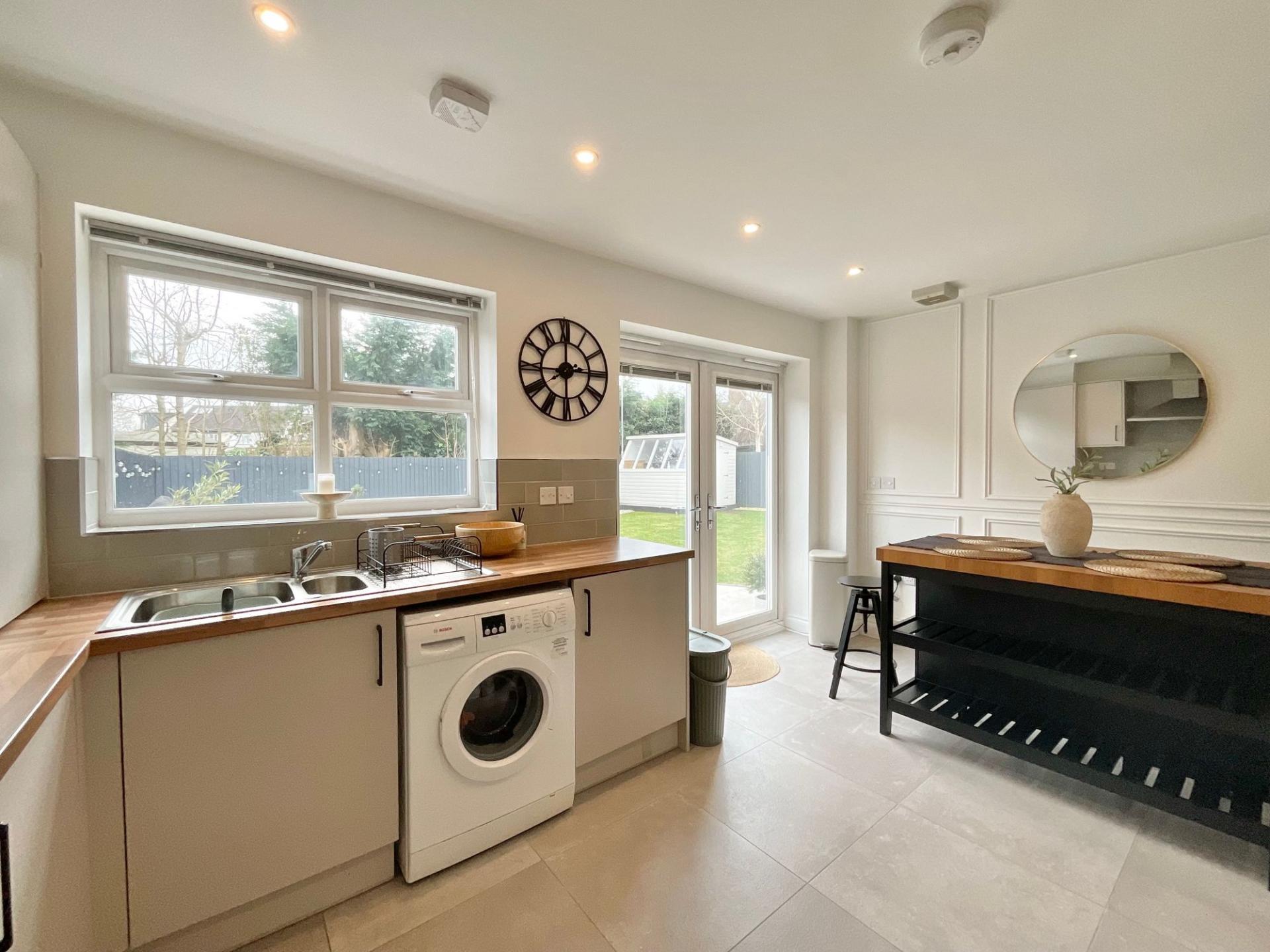 To the rear of the home is the impressive kitchen/diner, designed to be the social hub of the property. This stylish open-plan space features a sleek, contemporary kitchen with ample storage and preparation space. The kitchen is well-equipped with an integrated oven and gas hob, while also providing space for both a fridge/freezer and washing machine. There is ample room for a dining table, making it ideal for family meals or hosting guests. French doors open directly from the kitchen into the garden, allowing natural light to fill the room and creating a seamless connection between indoor and outdoor living.