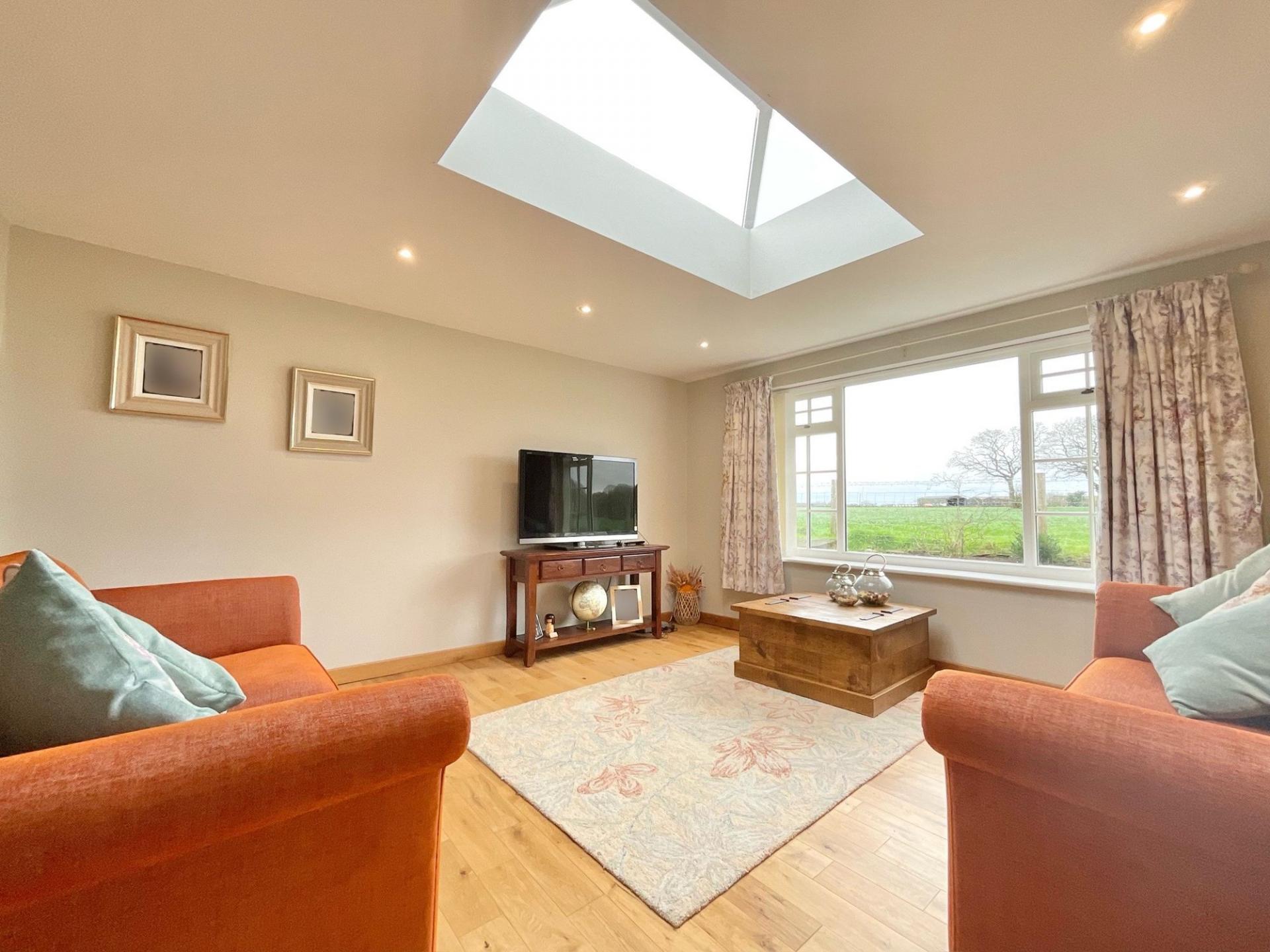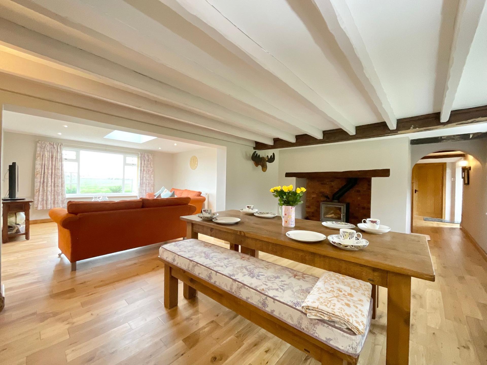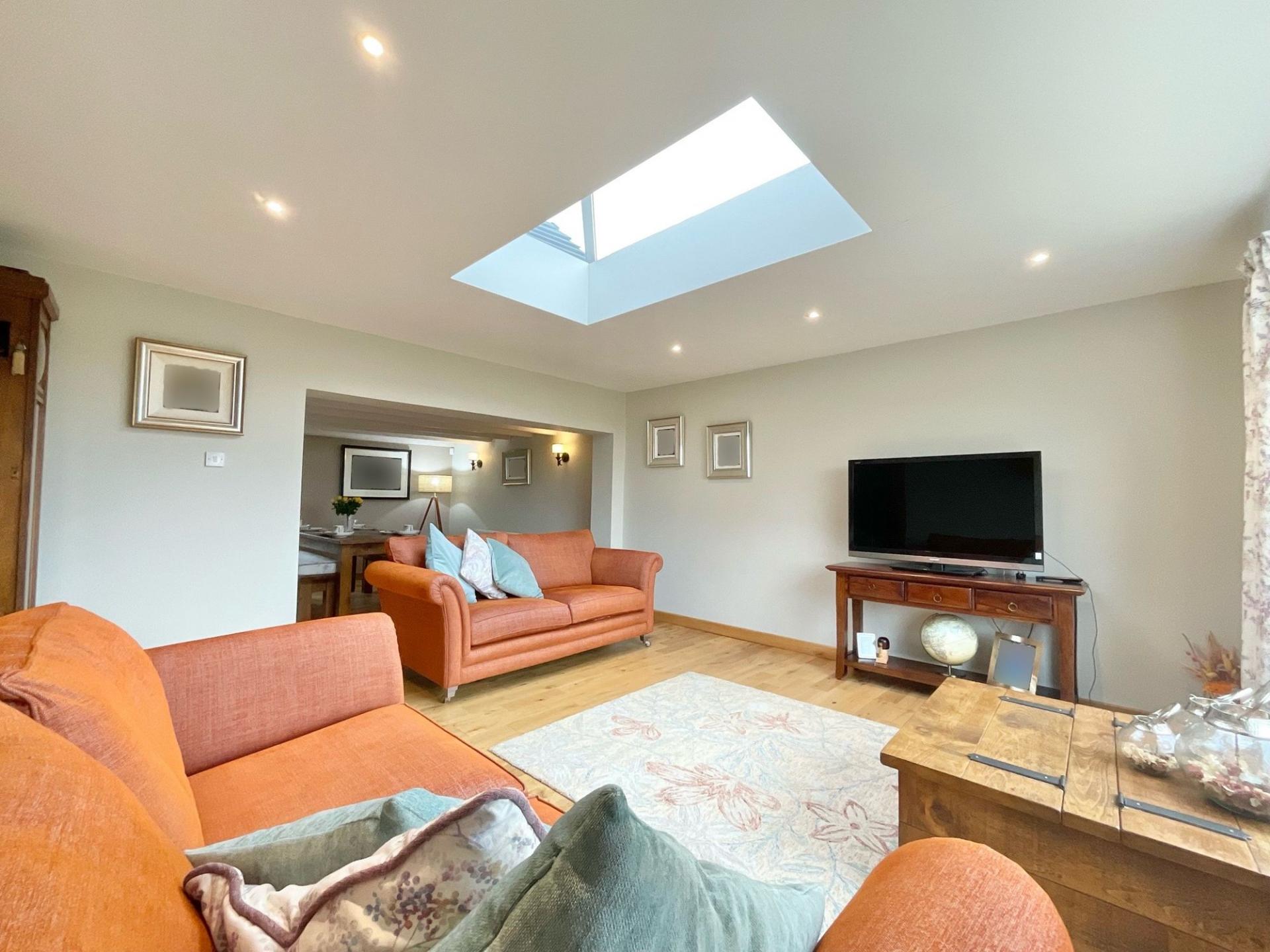 - Light-filled living spaces with skylight, log burner, sociable kitchen seating, and breakfast bar for entertaining.