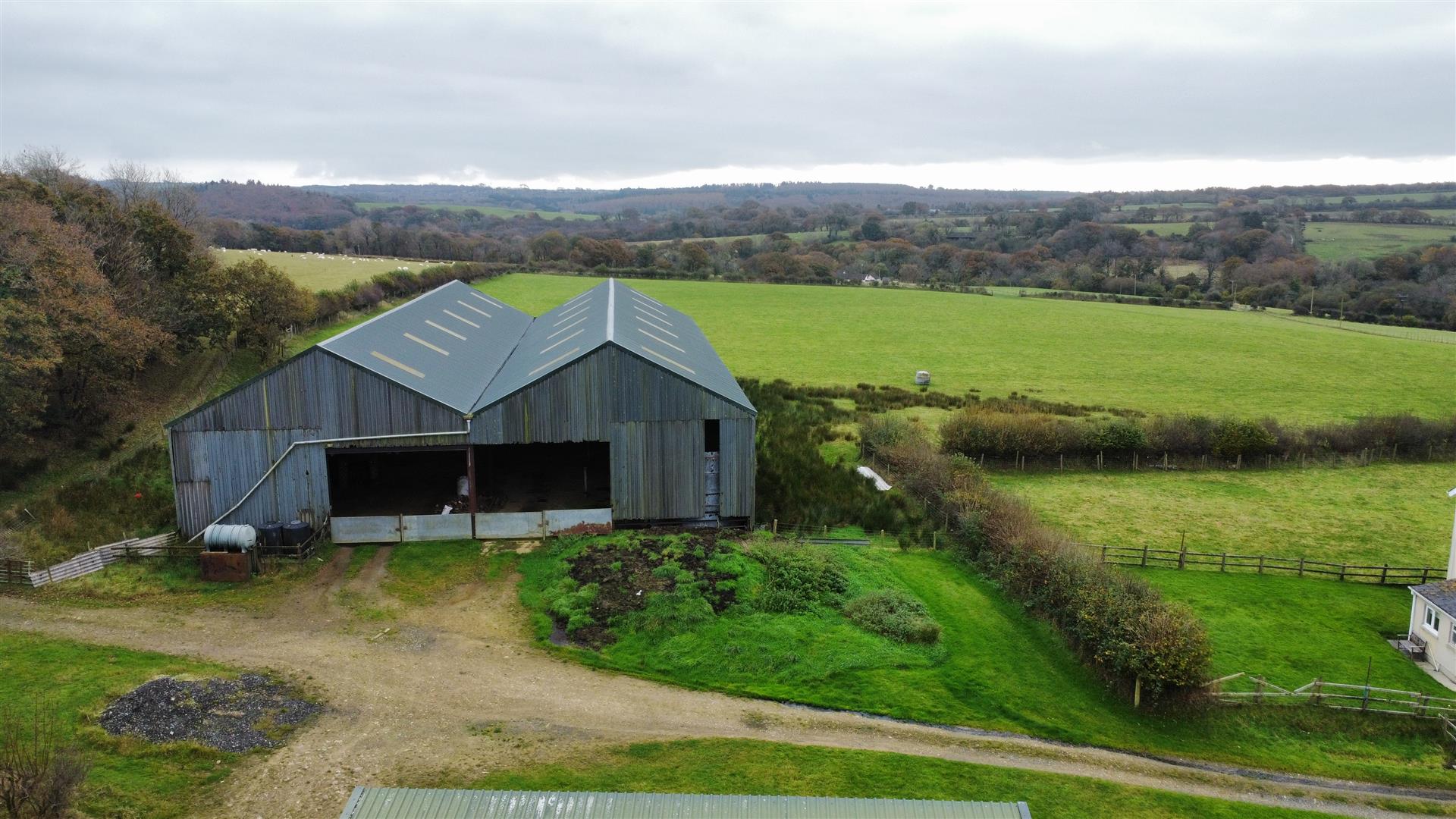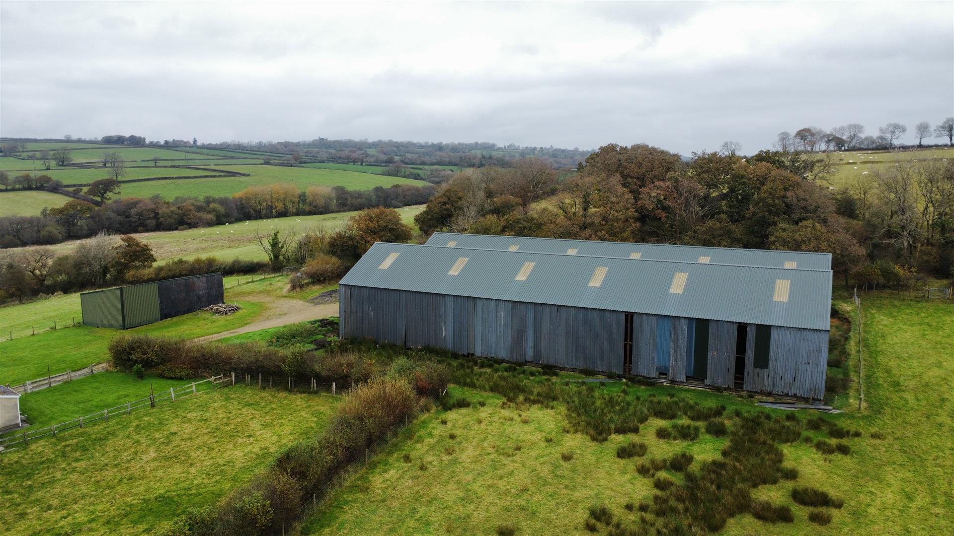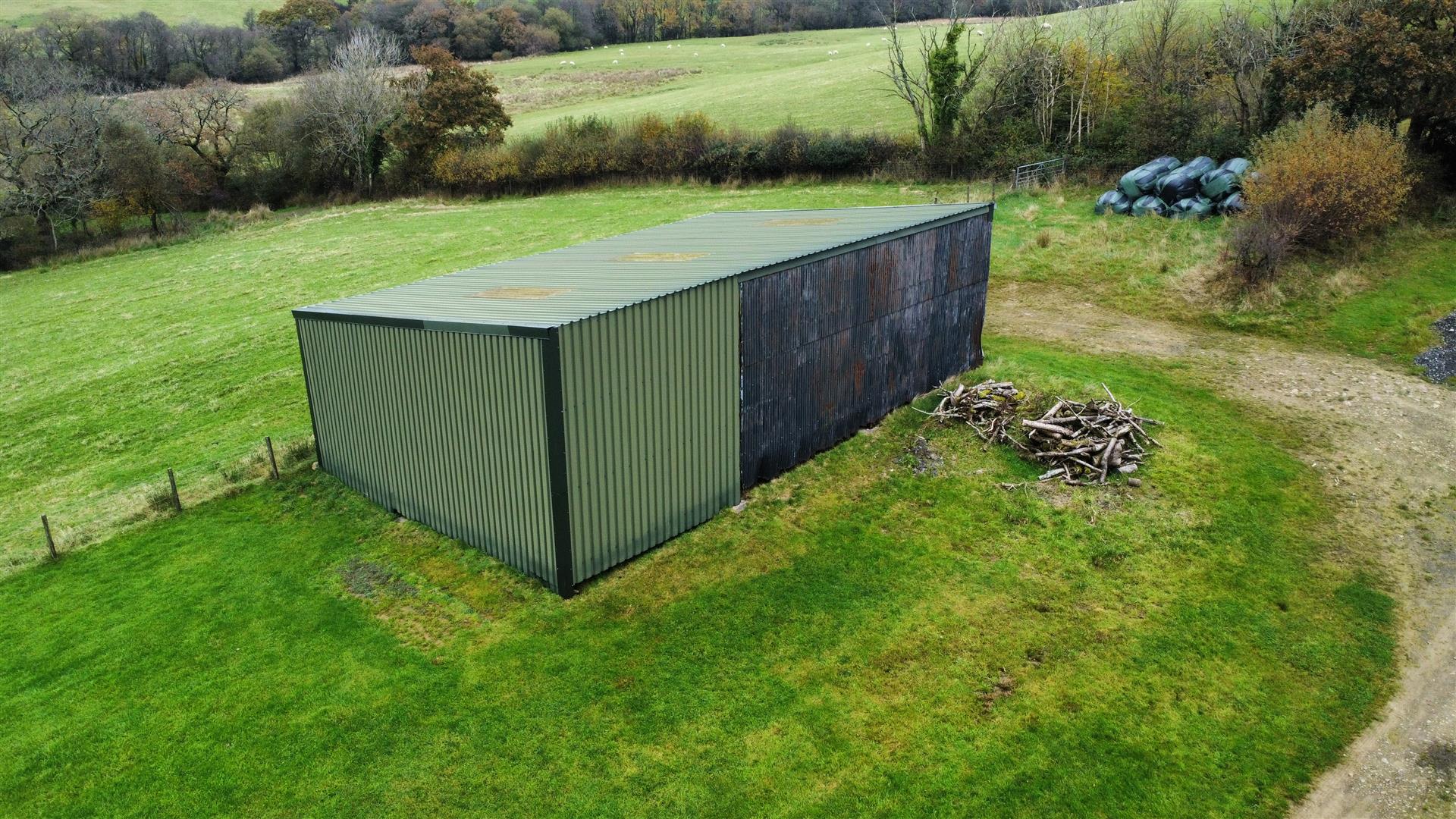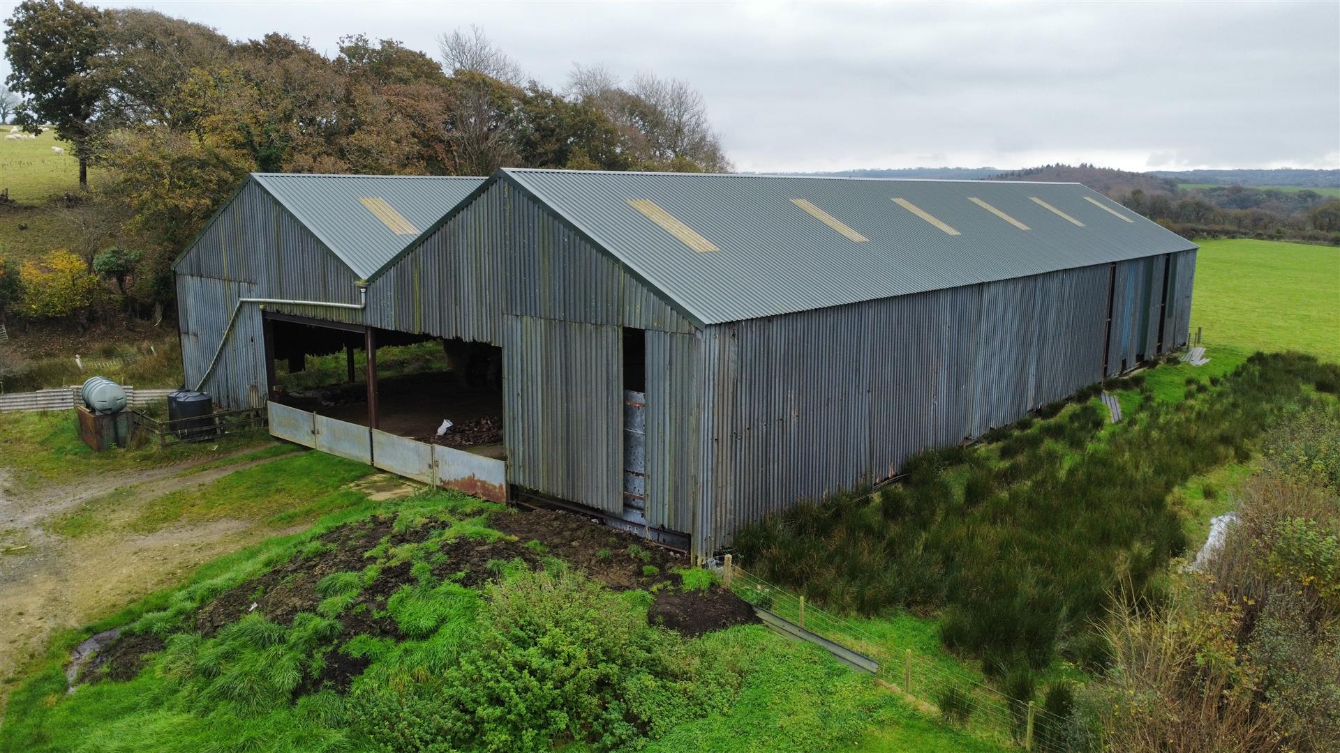 2 Steel Portal Frame Buildings clad with corrugated iron under either a cement fibre or corrugated iron roof and adjoining one, extending to 145' x 80' to 44m x 27m approximately overall. This building provides cattle housing, crop and machinery storage. 2 bay open fronted steel portal frame Shed with corrugated iron and box profile clad elevations under a box profile clad roof used for machinery storage.