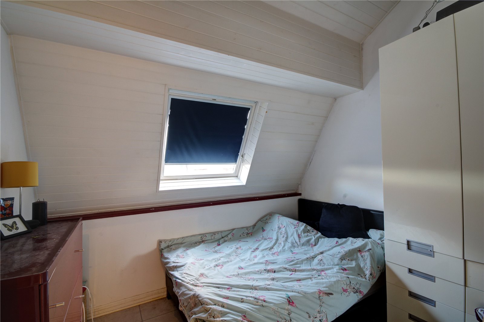 Velux window, wall mounted electric heater, tiled flooring.