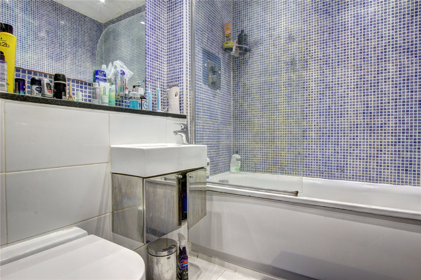 Panel bath with shower over head and glass screen, wall mounted wash hand basin, WC, tiled walls, extractor fan, down lighting.