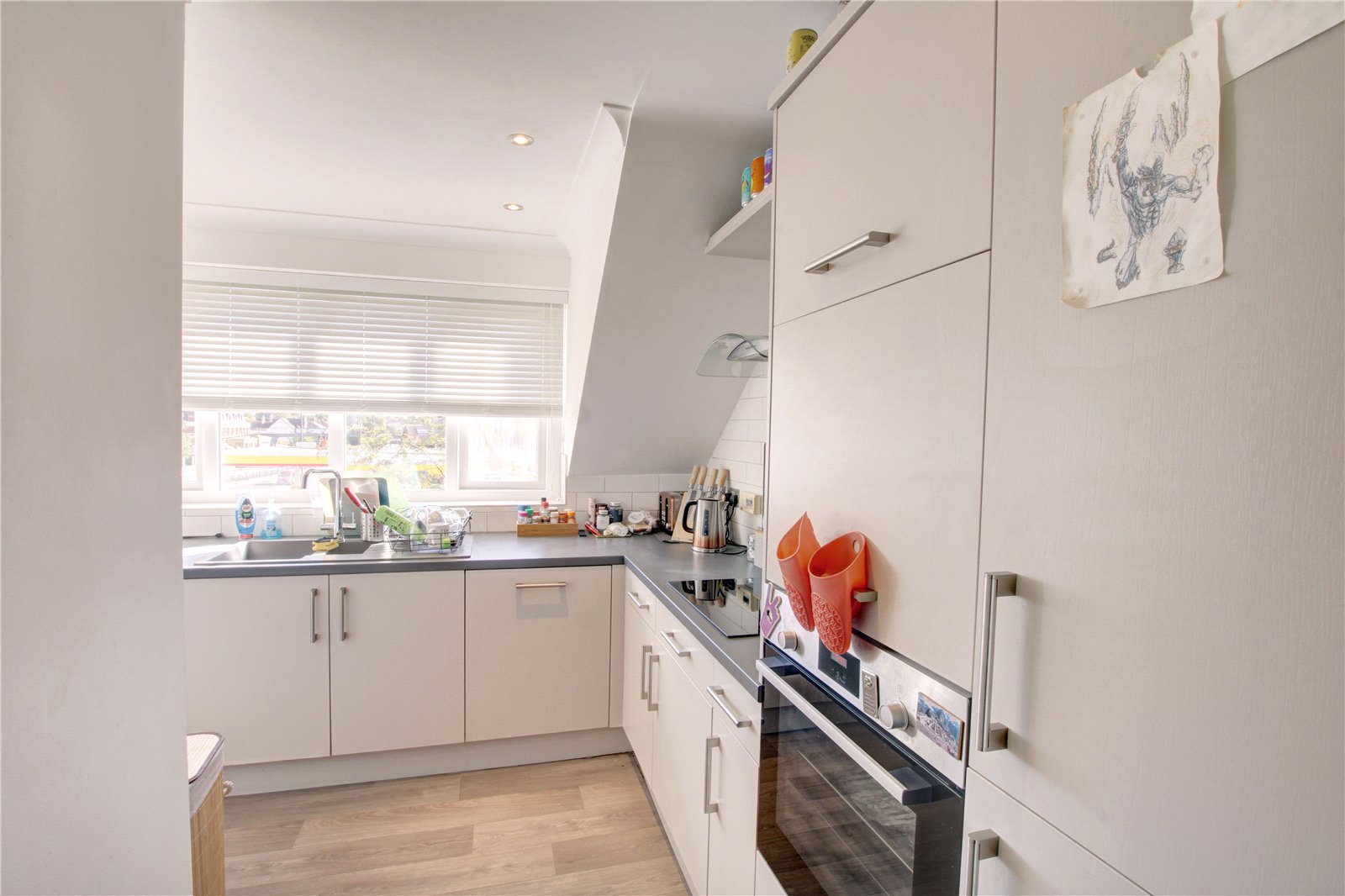 Range of refitted wall and base units with worktop surfaces incorporating one and a half bowl sink unit with mixer tap, integrated electric oven and hob with extractor fan above, integrated fridge/freezer, washing machine and dishwasher, part tiled walls, double glazed windows to side elevation, large storage cupboard housing gas fired boiler.
