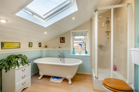 Bathroom - Corner shower cubicle and inset Mira shower system, claw bath with central mixer tap and shower detachment, panelled walls, double radiator, Victorian style WC, pedestal wash hand basin, chrome heated towel, inset spotlighting, side aspect window, front aspect Velux roof light.