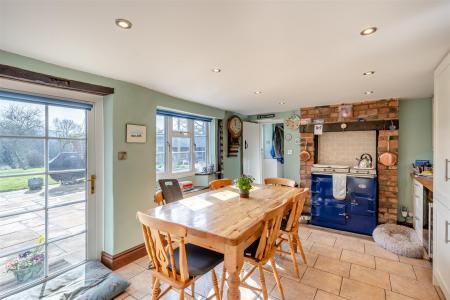 Kitchen/Breakfast Room - 7.06m x 3.38m (23'02 x 11'01) - Farmhouse kitchen comprising of a range of base and wall mounted units with wooden worktops and splashbacks, exposed Gorsley stone feature wall, exposed beamwork, tiled flooring, Everhot range oven, integrated appliances to include fridge / freezer, wine fridge, dishwasher, oven, five ring induction hob, kick heater, TV and telephone point, inset spotlighting, two rear aspect windows and a glazed door leading to patio and gardens offering lovely views. Thumb latch door to: