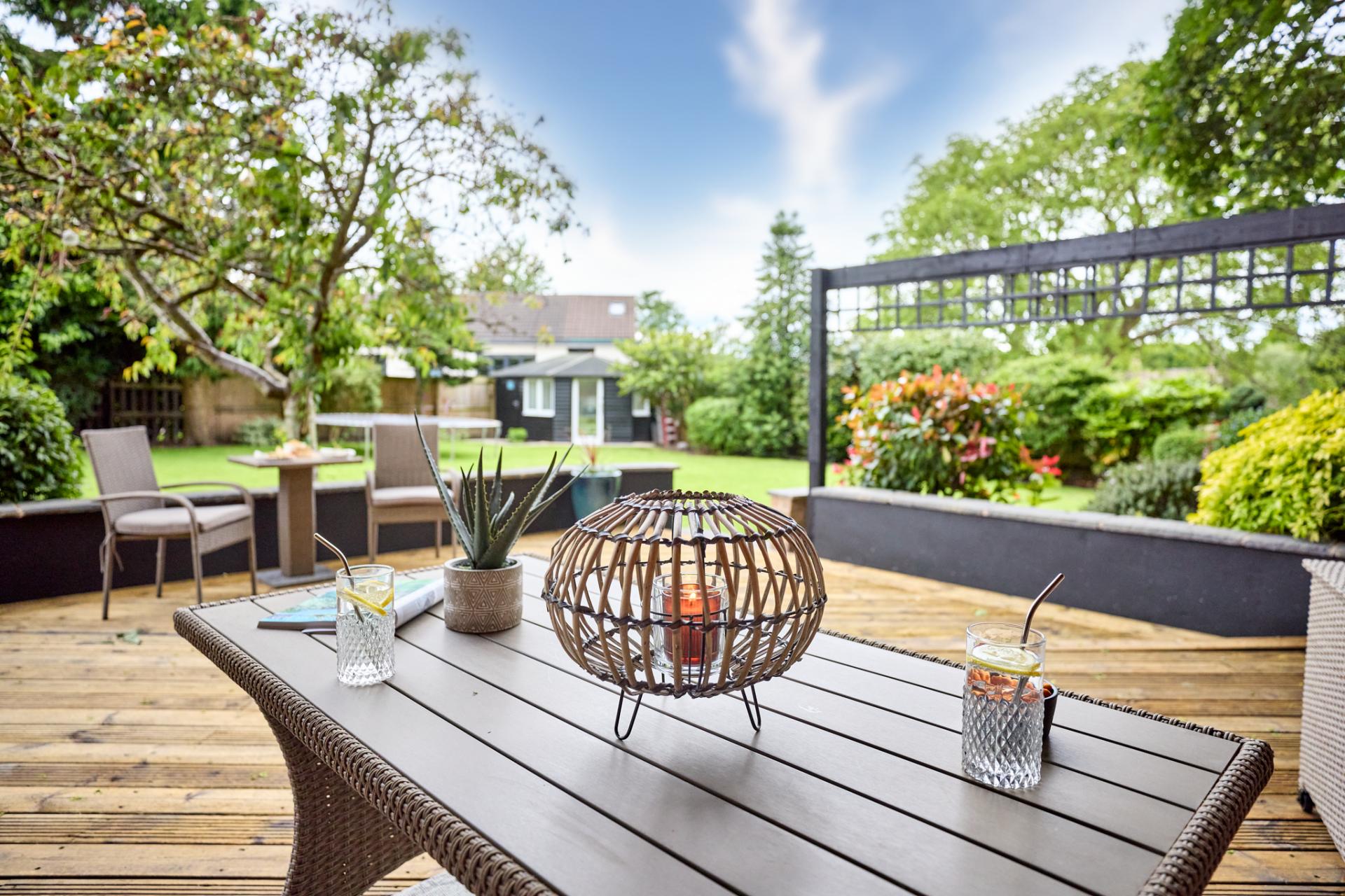 - Expansive Garden Plot with Covered Decking, Summerhouse and Manicured Lawn