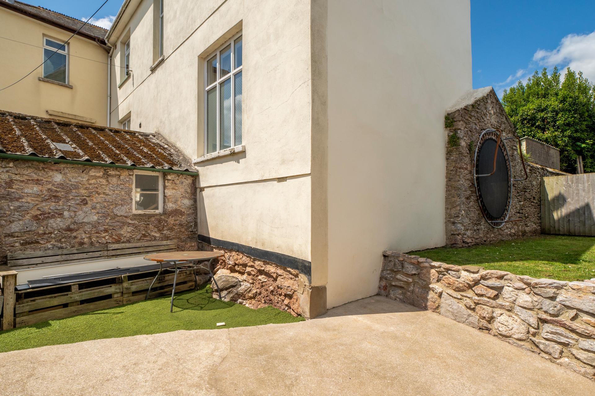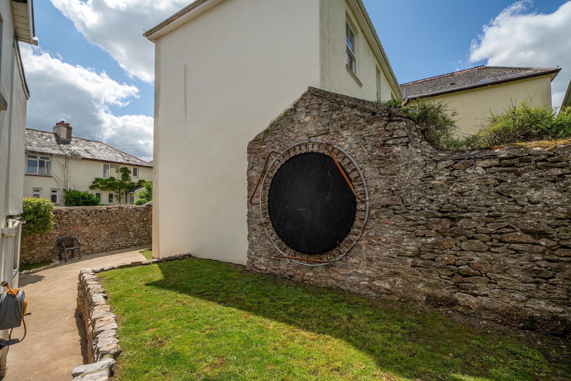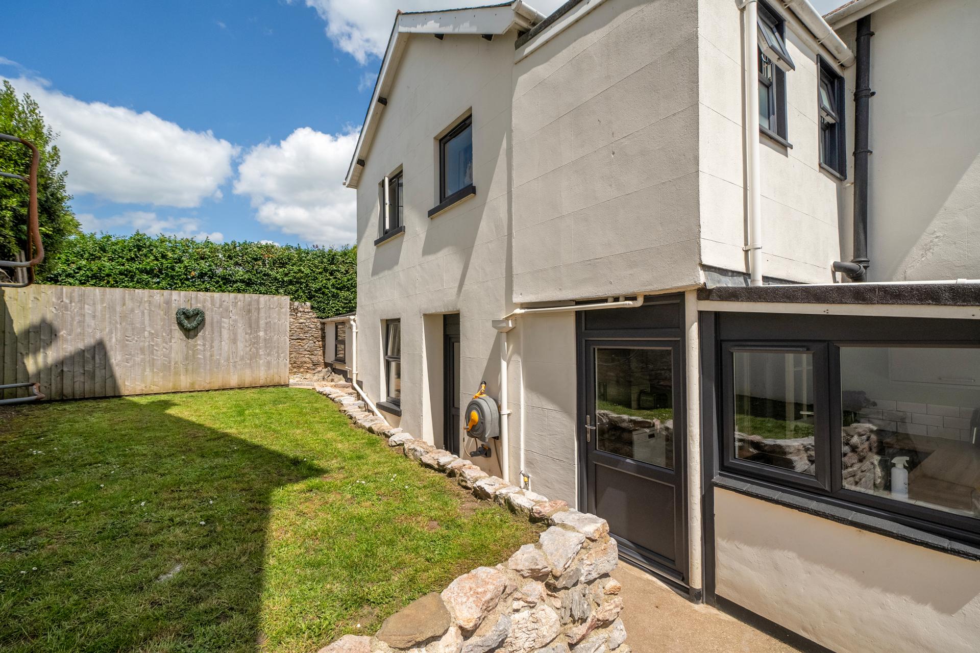 The front garden includes a lawned area and a concrete pathway leading to the front door, framed by the characterful stone wall. The rear garden features a pathway to the stone-built garage, with a separate lawned section enclosed by the original stone boundary – creating a safe and sunny space perfect for relaxing, children playing, or summer entertaining.