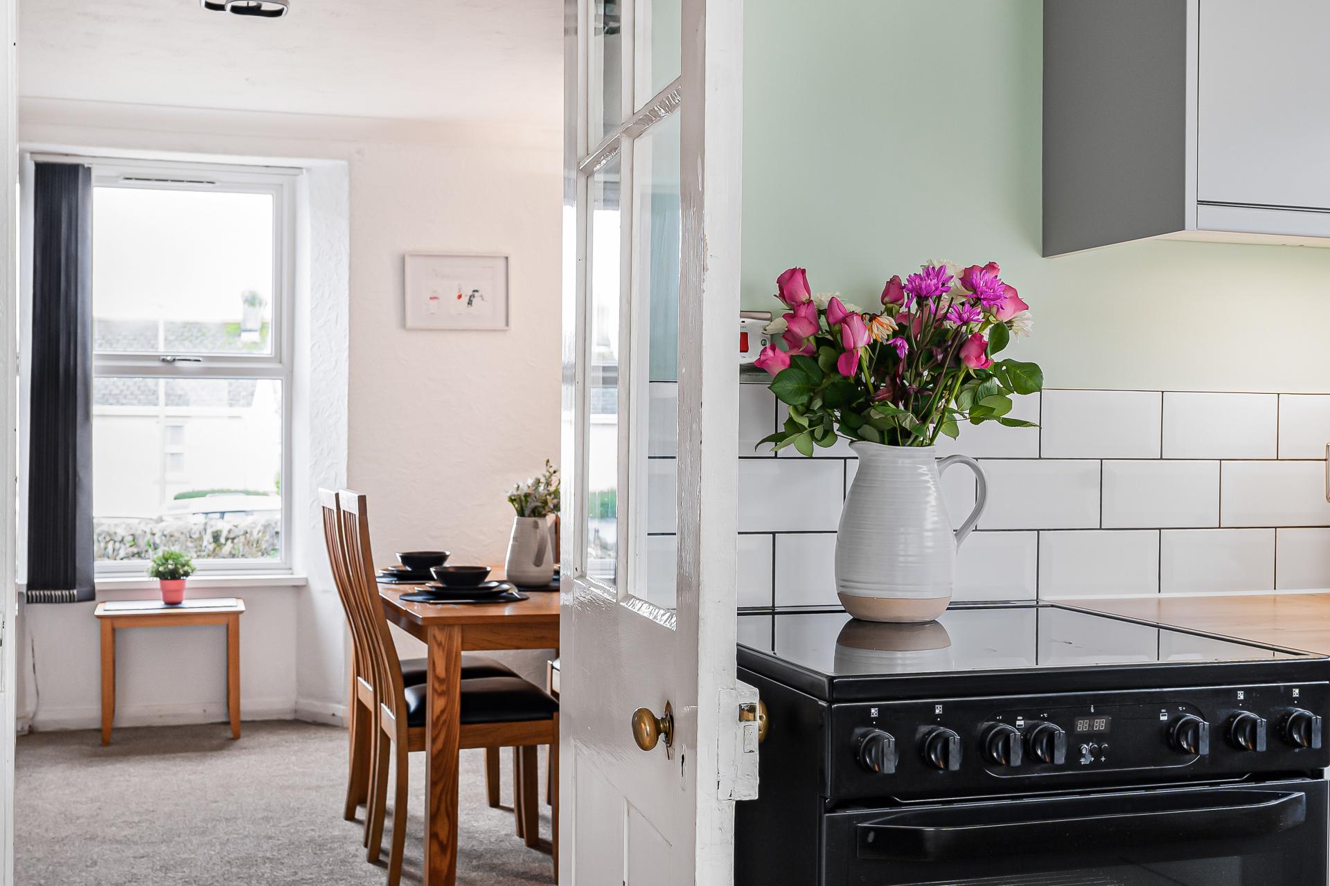 The dining room flows seamlessly into the recently fitted kitchen, which perfectly blends countryside charm with modern convenience. The kitchen features a sink with drainer, ample worktop space and plenty of storage, along with room for a freestanding cooker. There is also direct garden access from the kitchen.