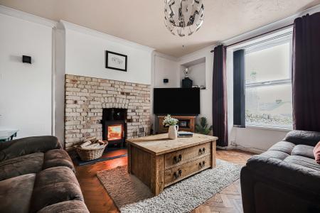 Stepping through the storm porch front door into a spacious entrance hallway. Directly ahead, stairs lead to the first floor, while to the right you'll find a well-proportioned main living room, complete with stunning parquet flooring and a log burner set within a feature fireplace – ideal for cozy evenings in.