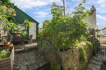 The rear garden includes a stone-built workshop, suitable for storage, potting, or, with appropriate permissions, conversion into an office or studio. Steps lead to a gravel patio area, perfect for outdoor dining and entertaining. Beyond this, a lawn is bordered with mature shrubs and plants, creating a vibrant and colourful setting that beautifully complements the cottage.