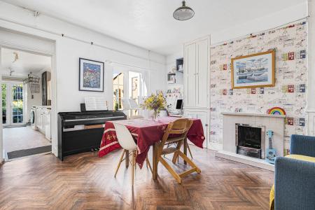 The dining room includes built-in storage flanking the fireplace, access to a convenient cloakroom with WC and hand basin, and stairs leading to the first floor. French doors open onto the rear courtyard, while an additional door leads into the well-equipped kitchen. The kitchen features a range of wall and base units, ample worktop space, a sink with mixer tap, and a wall-mounted gas boiler. There are designated spaces for a washing machine, dishwasher, cooker, and fridge freezer. French doors lead directly into the rear garden, seamlessly connecting indoor and outdoor living.