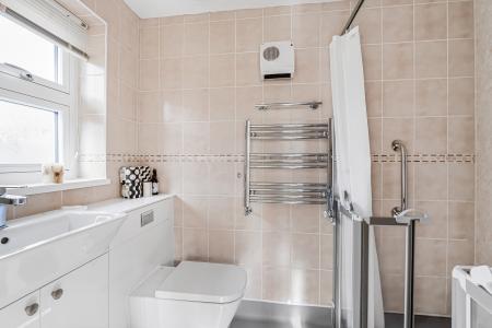 A separate modern shower room comprises a walk-in shower, wash hand basin and WC, finished with contemporary tiling and natural light.