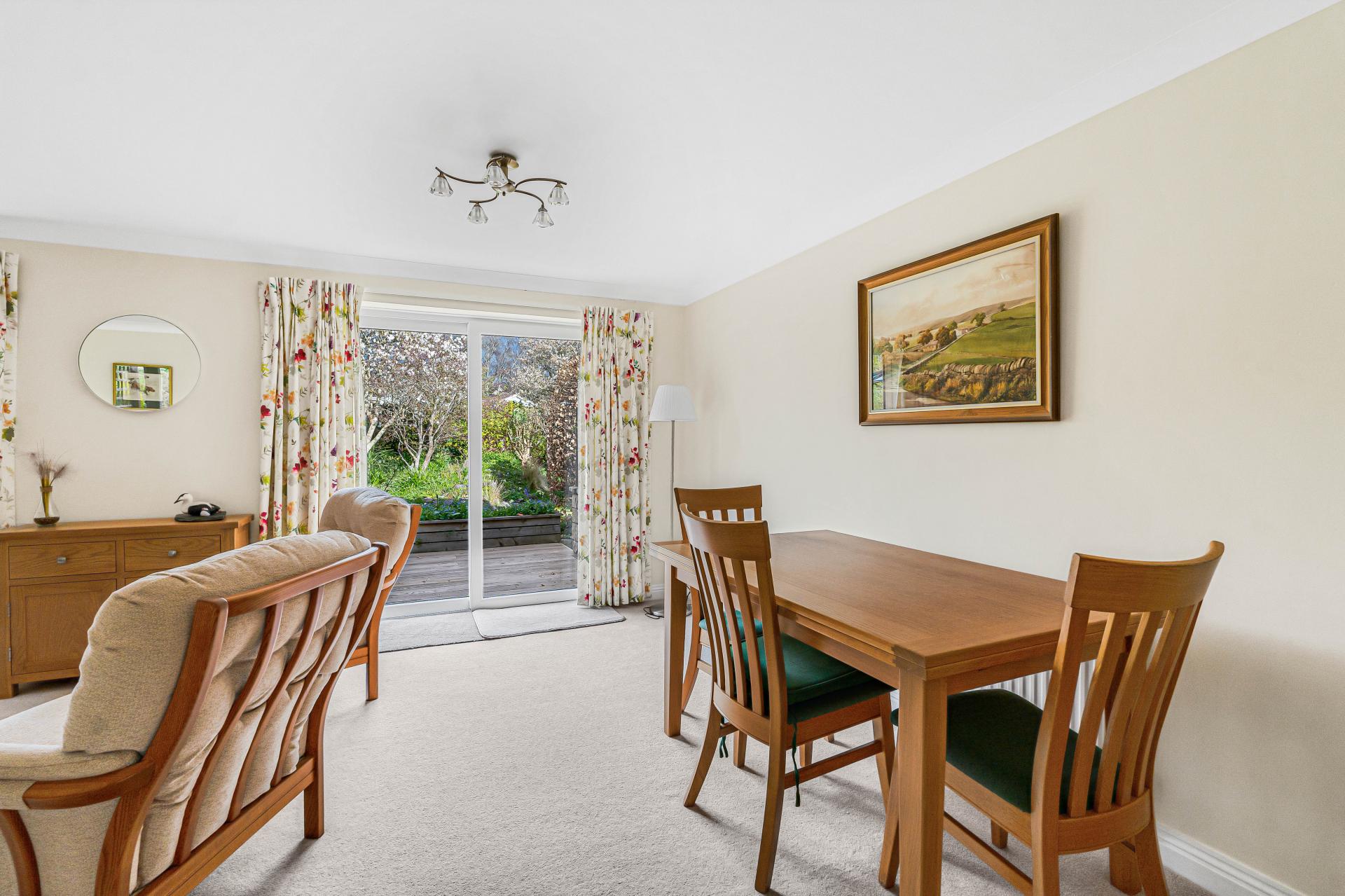 The rear garden is generous and established, mainly laid to lawn with mature trees and planting. A patio area offers ideal space for outdoor dining, with direct access from the living room, and the garden extends further to provide a peaceful outdoor setting.