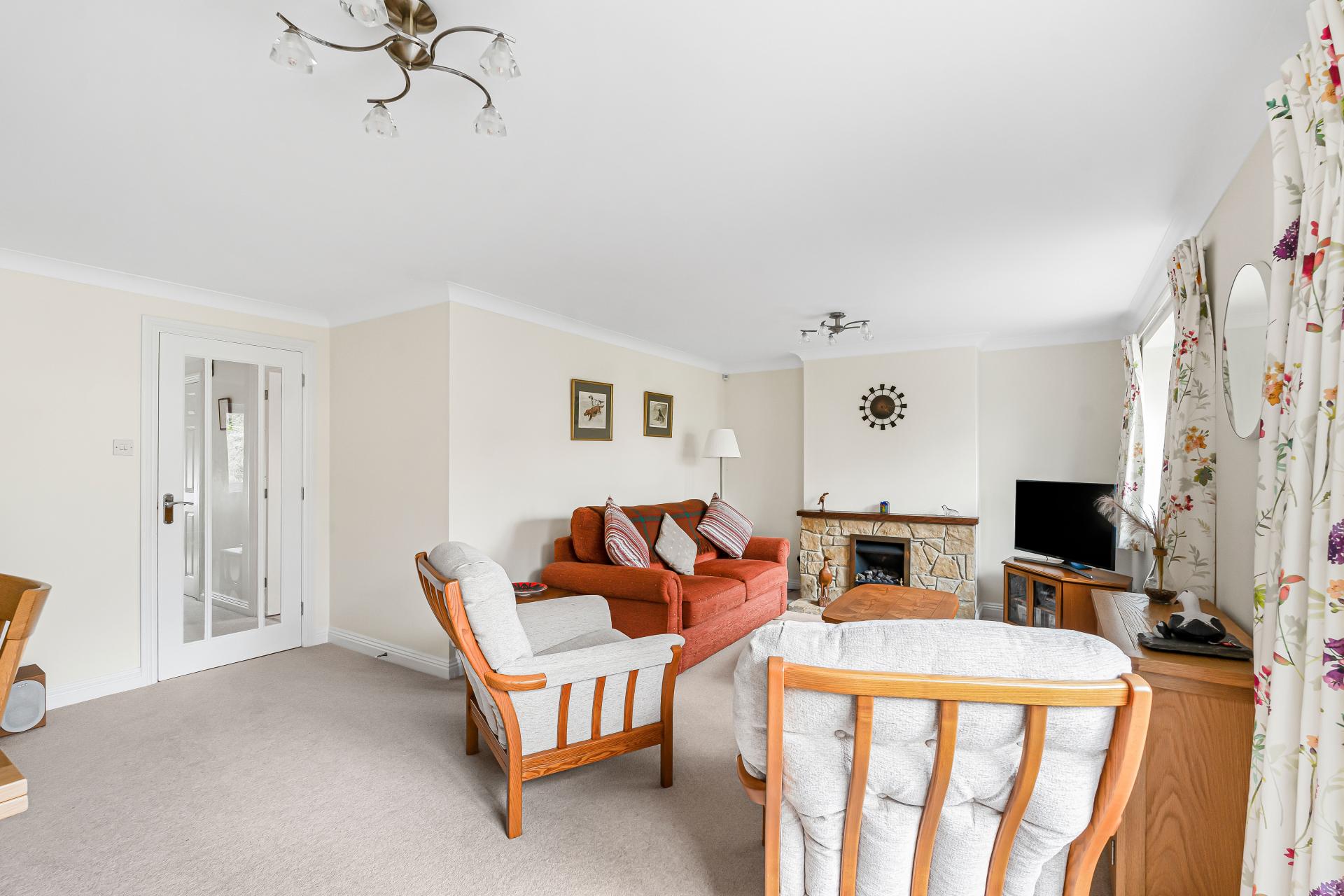 The living room is bright and generously sized, comfortably accommodating both seating and dining areas. A large window and sliding patio doors allow plenty of natural light and provide direct access to the garden, while a feature fireplace creates an attractive focal point.