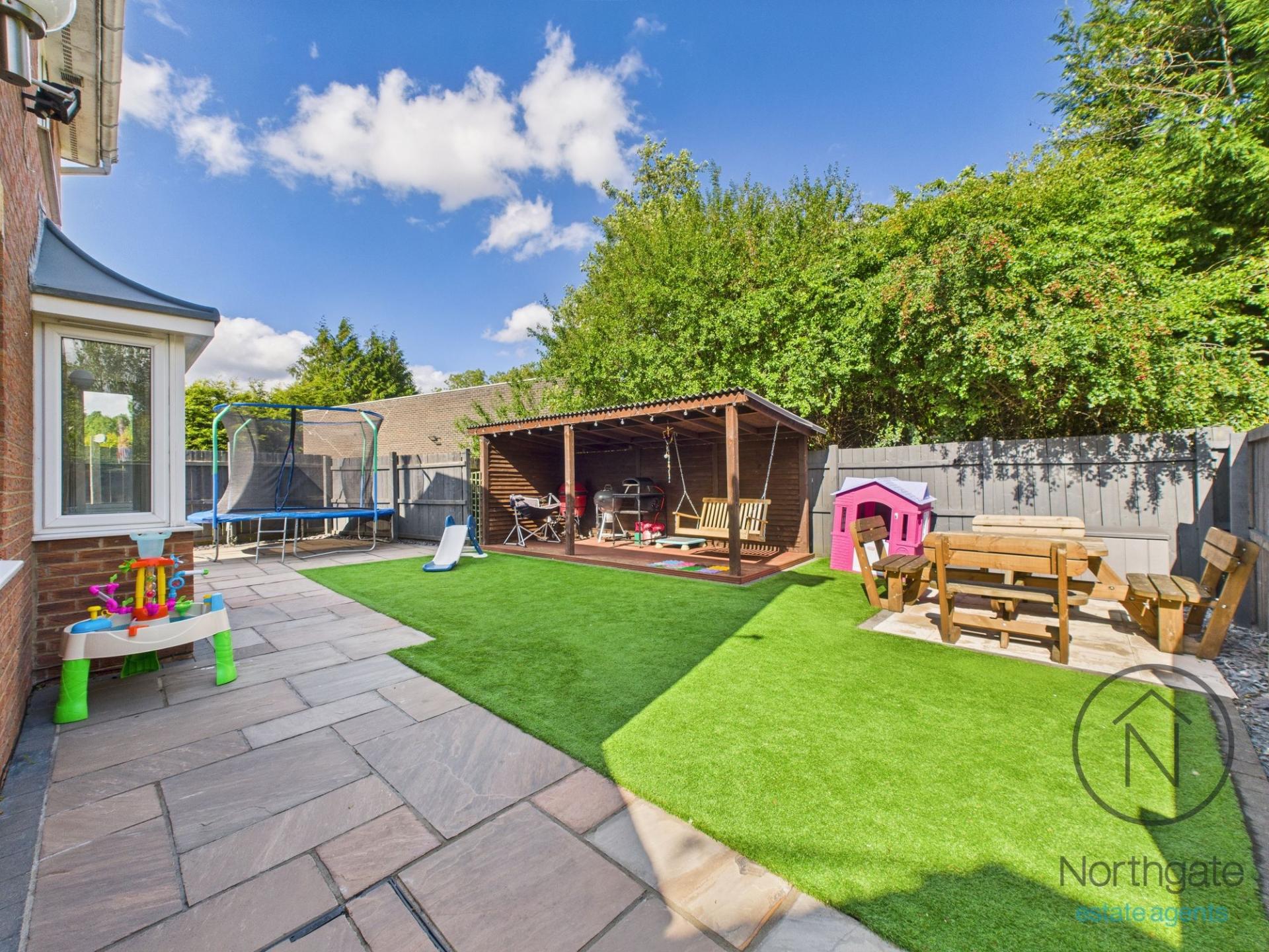To the front, there is off-street parking for multiple vehicles. The enclosed rear garden is mainly laid to lawn and includes decked seating areas and a storage shed.