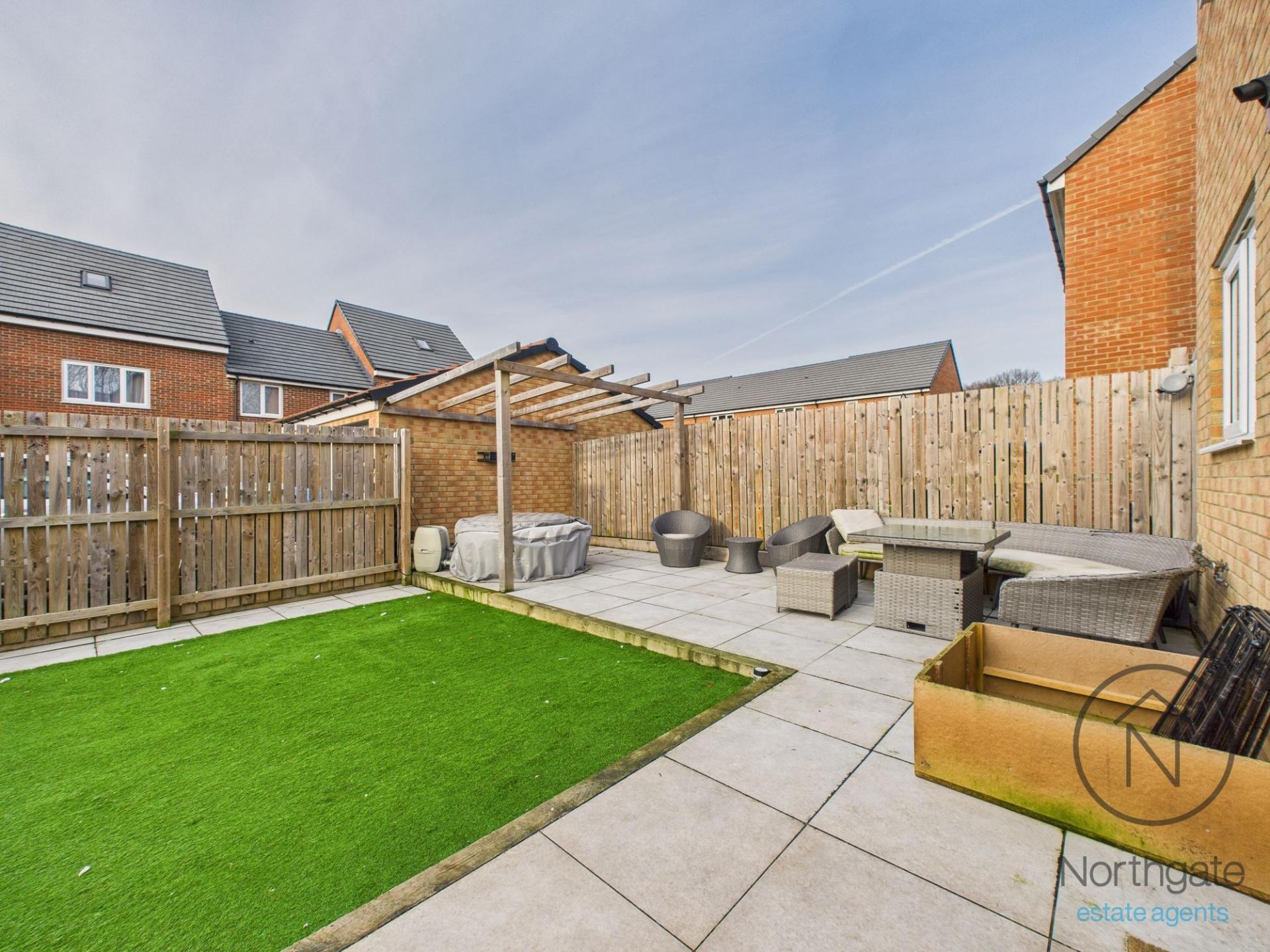 Externally, the front of the property features a pathway leading to the front door, with lawned areas and established shrubs. To the rear is a low-maintenance garden with patio area, artificial lawn, pergola, and gated access to the garage. A driveway leads to a single detached garage, providing secure parking and useful additional storage.