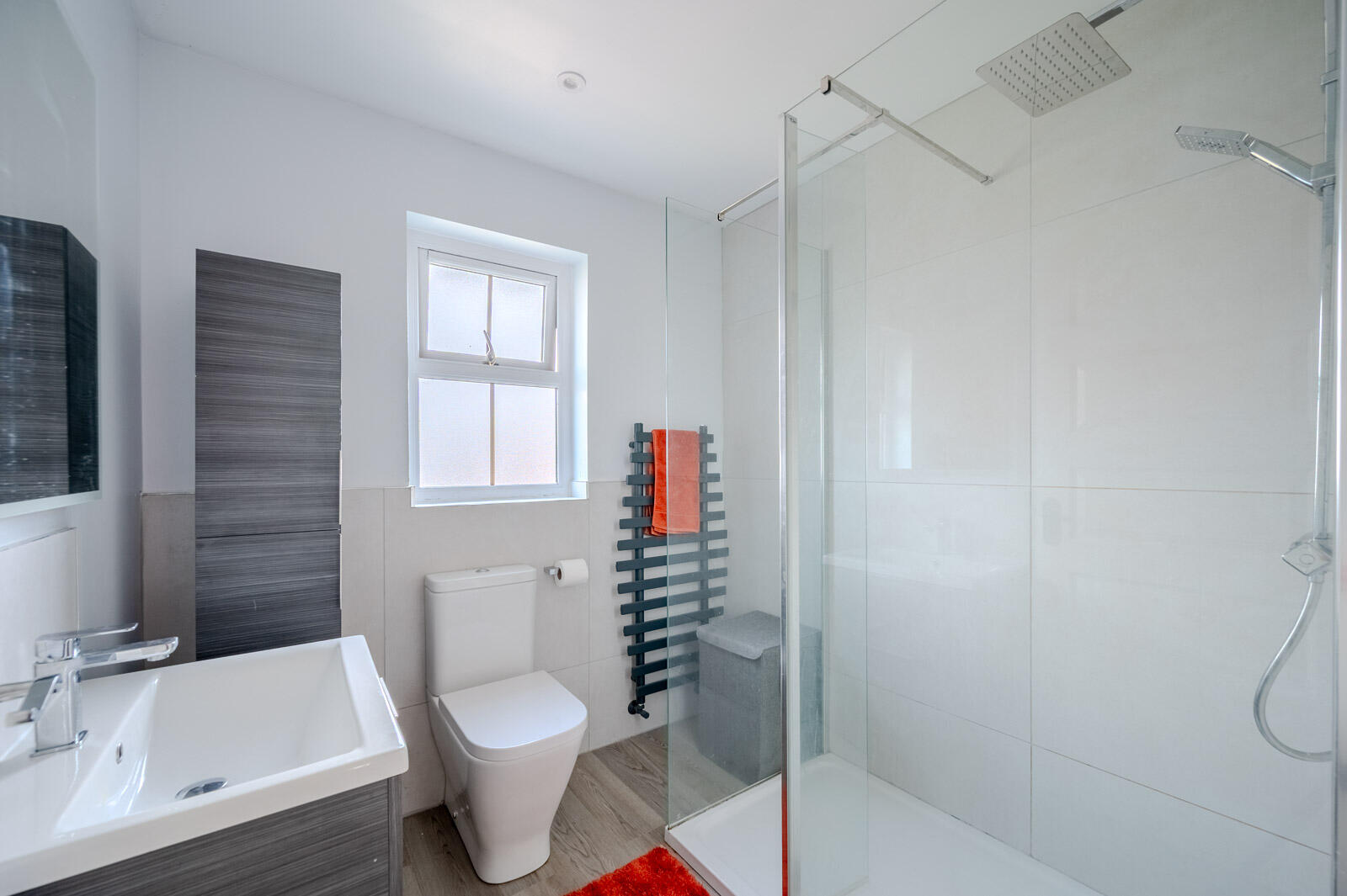 Shower Room - Three Piece Suite Comprising Shower Cubicle, Wash Hand Basin With Mixer Tap, Tiled Splashback, Storage Beneath, Low Flush Wc, Heated Towel Rail, Laminate Tile Effect Floor, Part Tiled Walls, Extractor Fan.