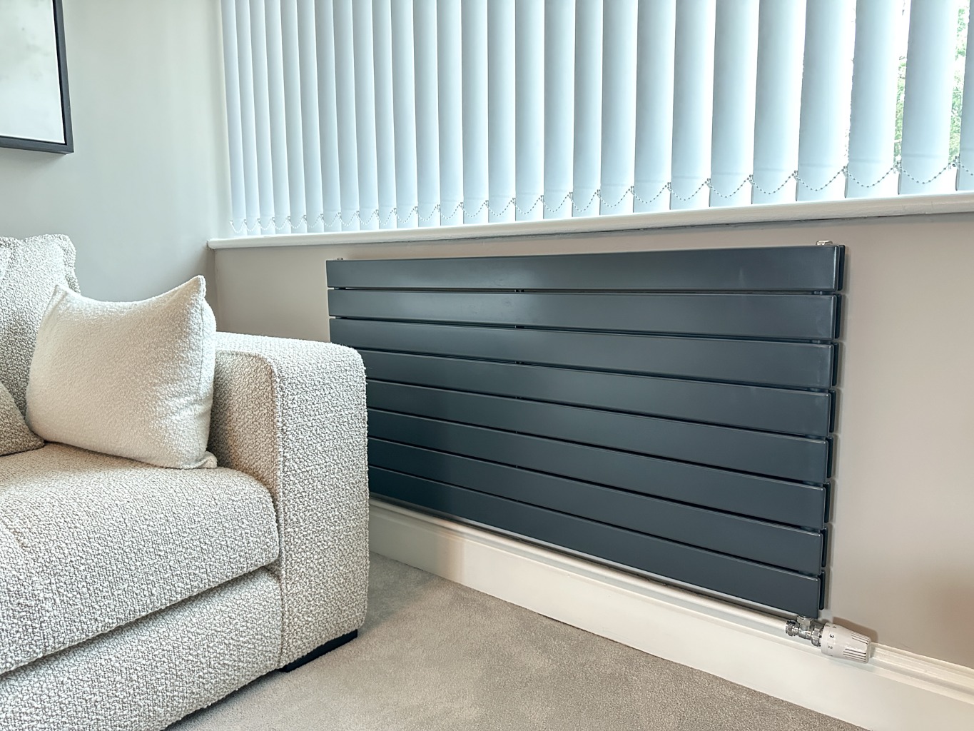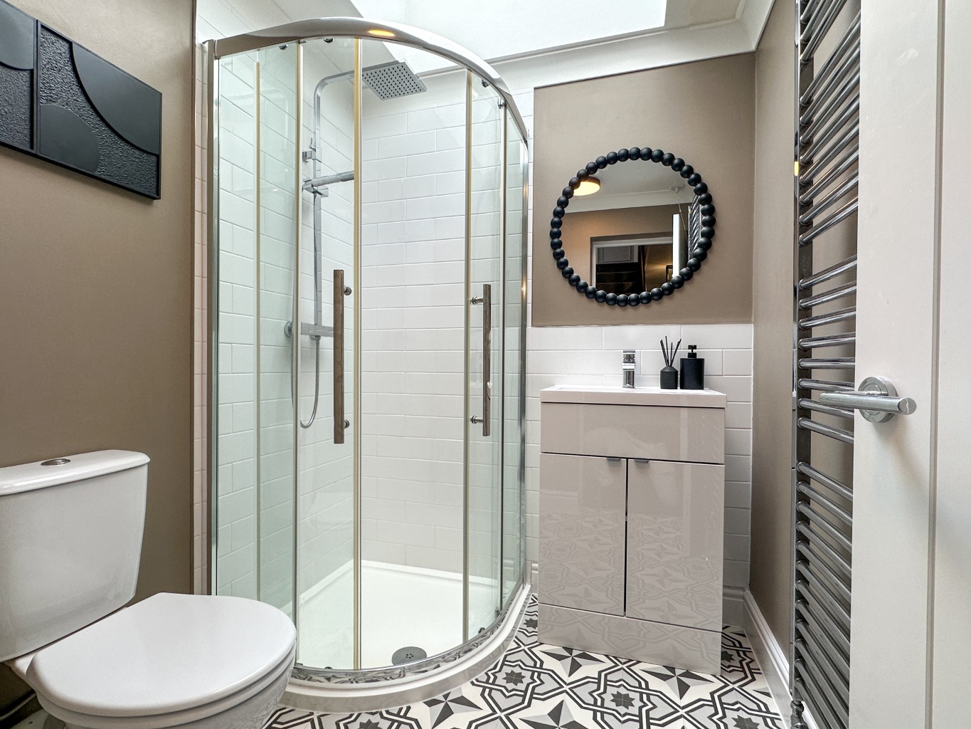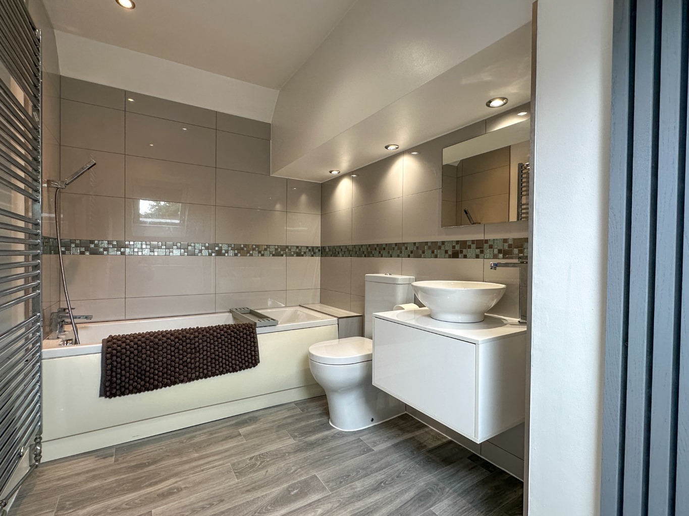 - Stunning Bathroom Suite with Down-lights, Chrome Towel Rad and a Contemporary Wash Basin mounted on a Floating Wash Stand