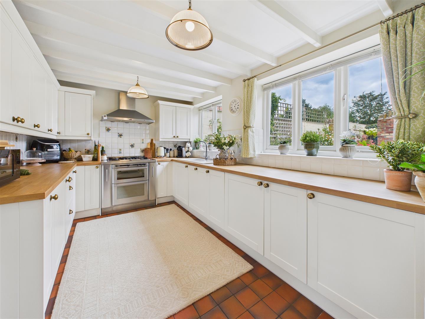 Kitchen - Having a recently installed kitchen with a range of shaker style units, contemporary work surfaces, stoves, sink and drainer unit, dishwasher, washer/dryer, integrated fridge and freezer. There is also a range cooker with matching extractor hood above. Tiled flooring and tiled surround. Two double glazed windows overlooking the rear garden. Painted beamed to ceiling.
