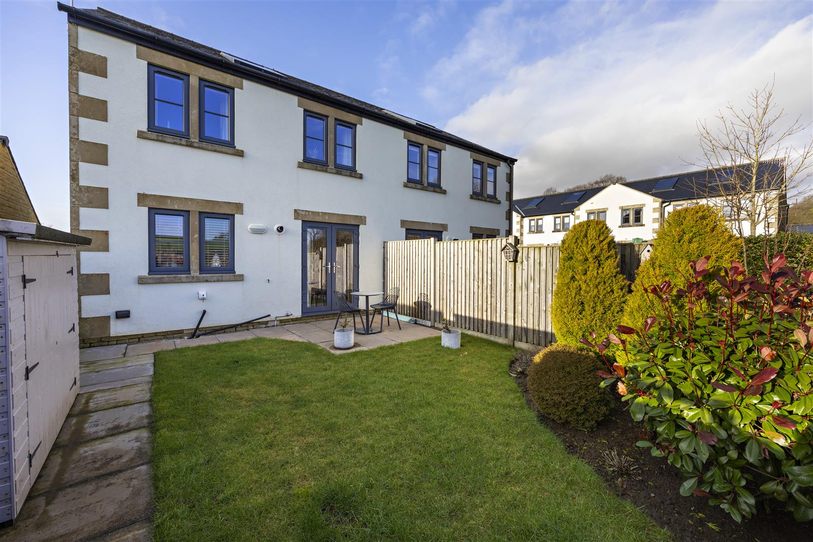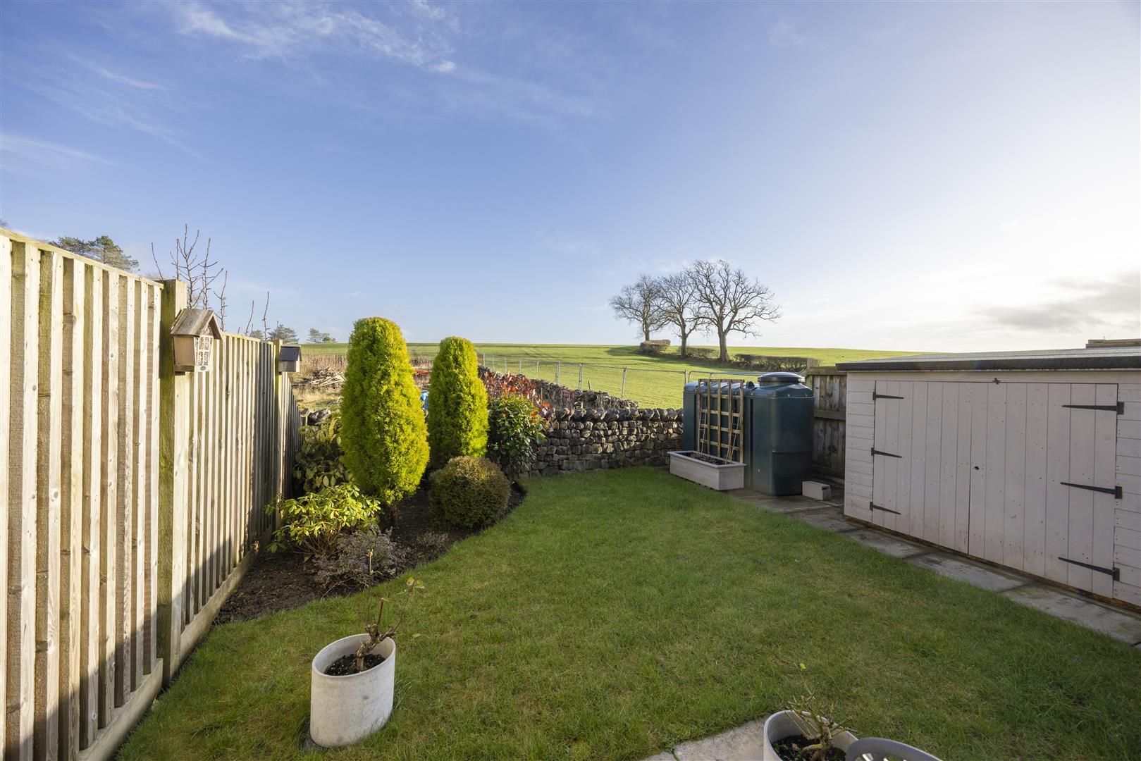 Rear Garden - Enclosed garden with patio seating area, lawn, garden store, fenced to side boundaries, drystone wall boundary to rear with views over open countryside, oil tank.