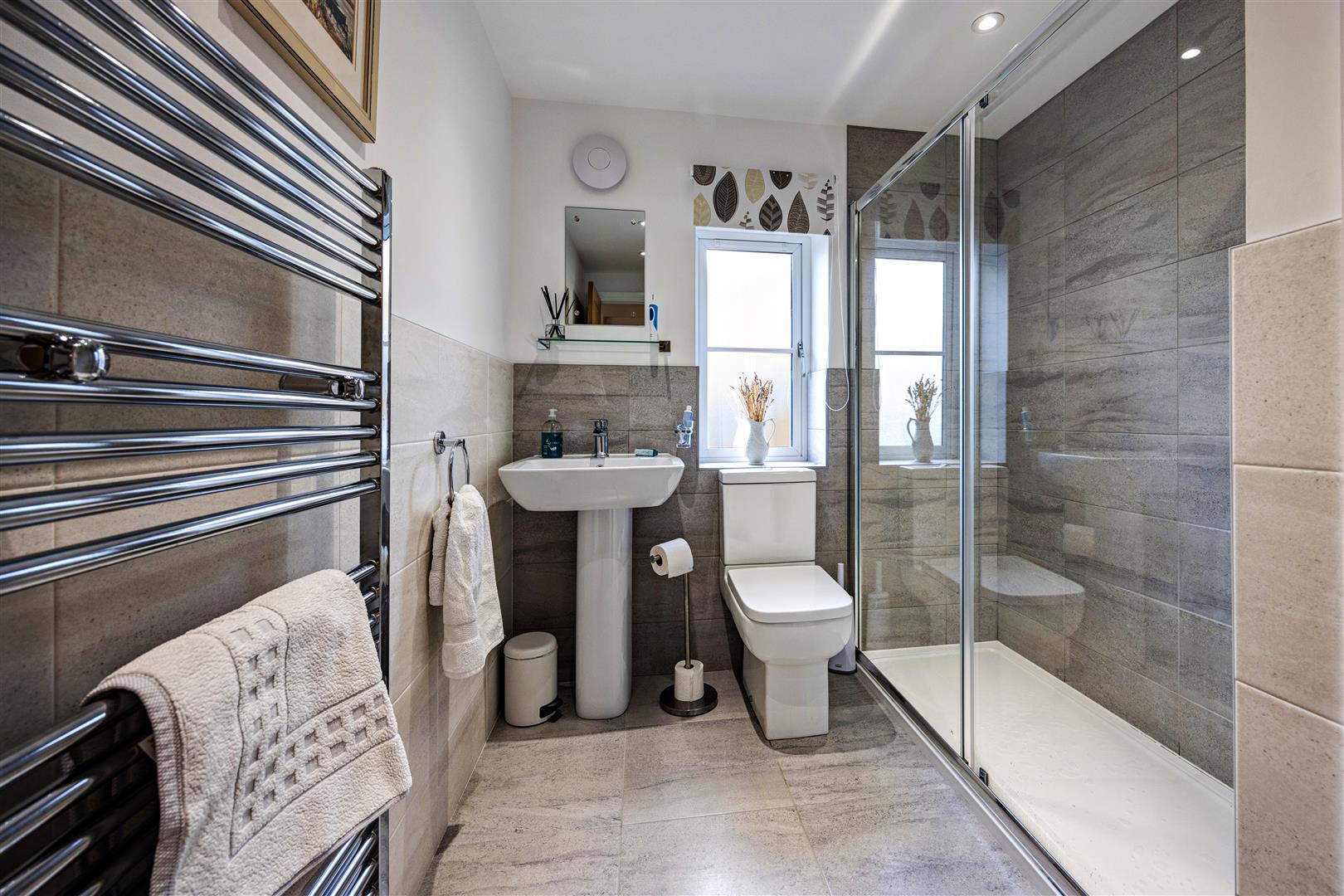 Bathroom - Tiled floor, walk in shower, wash basin, toilet, heated towel rail, airing cupboard housing hot water system and solar, double glazed window with textured glass.