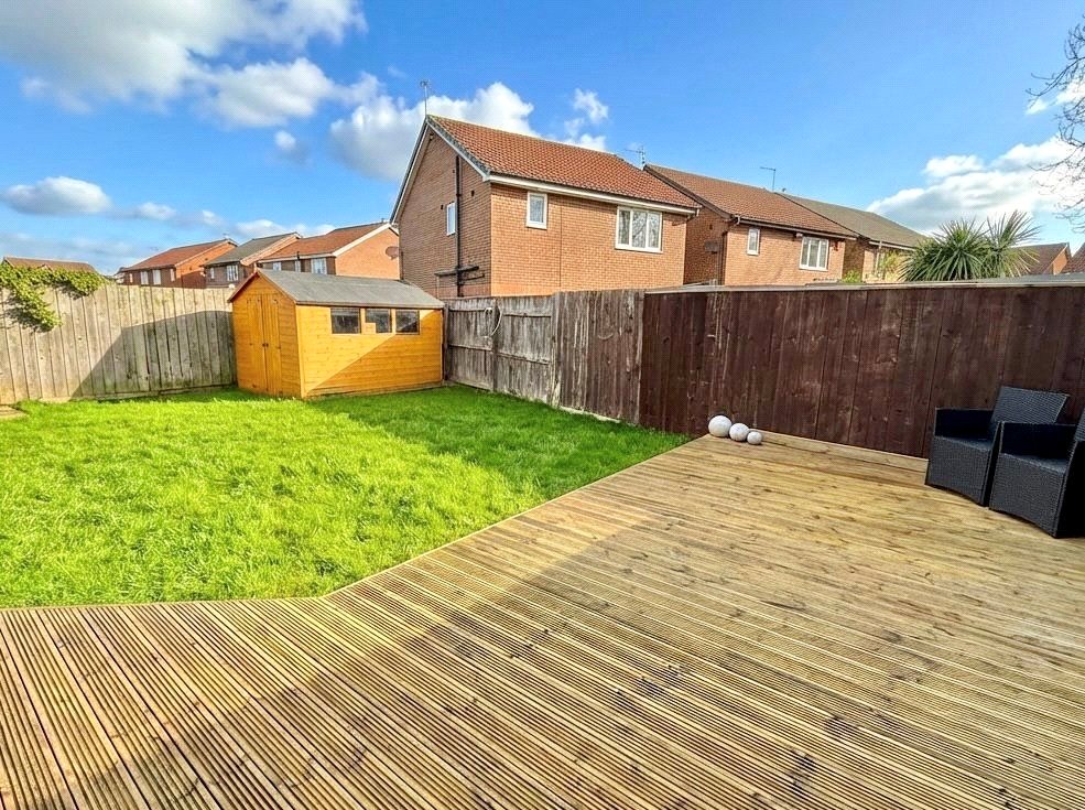 Externally, the property continues to impress. The extensive imprint concrete frontage provides generous parking and hardstanding, while to the rear is a private enclosed garden with an expansive decked seating area — ideal for entertaining and summer gatherings.