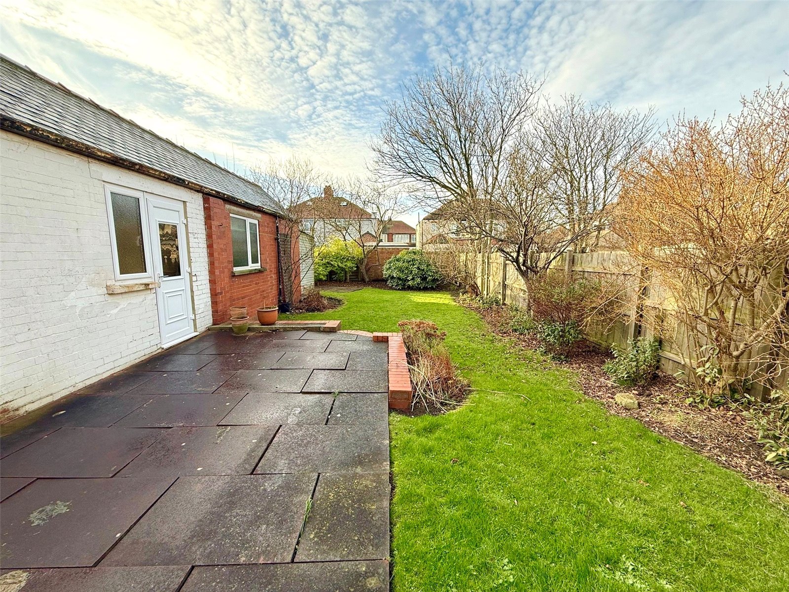 Externally, the property continues to impress. A long side driveway provides ample off-road parking and leads to a detached double-length garage, currently utilised as a gym. The south / west facing rear garden is a particular highlight, beginning with an extensive paved patio that extends to a lawned garden with attractive borders, offering a private and sun-filled outdoor space. The front garden provides additional kerb appeal, set behind a dwarf brick wall.