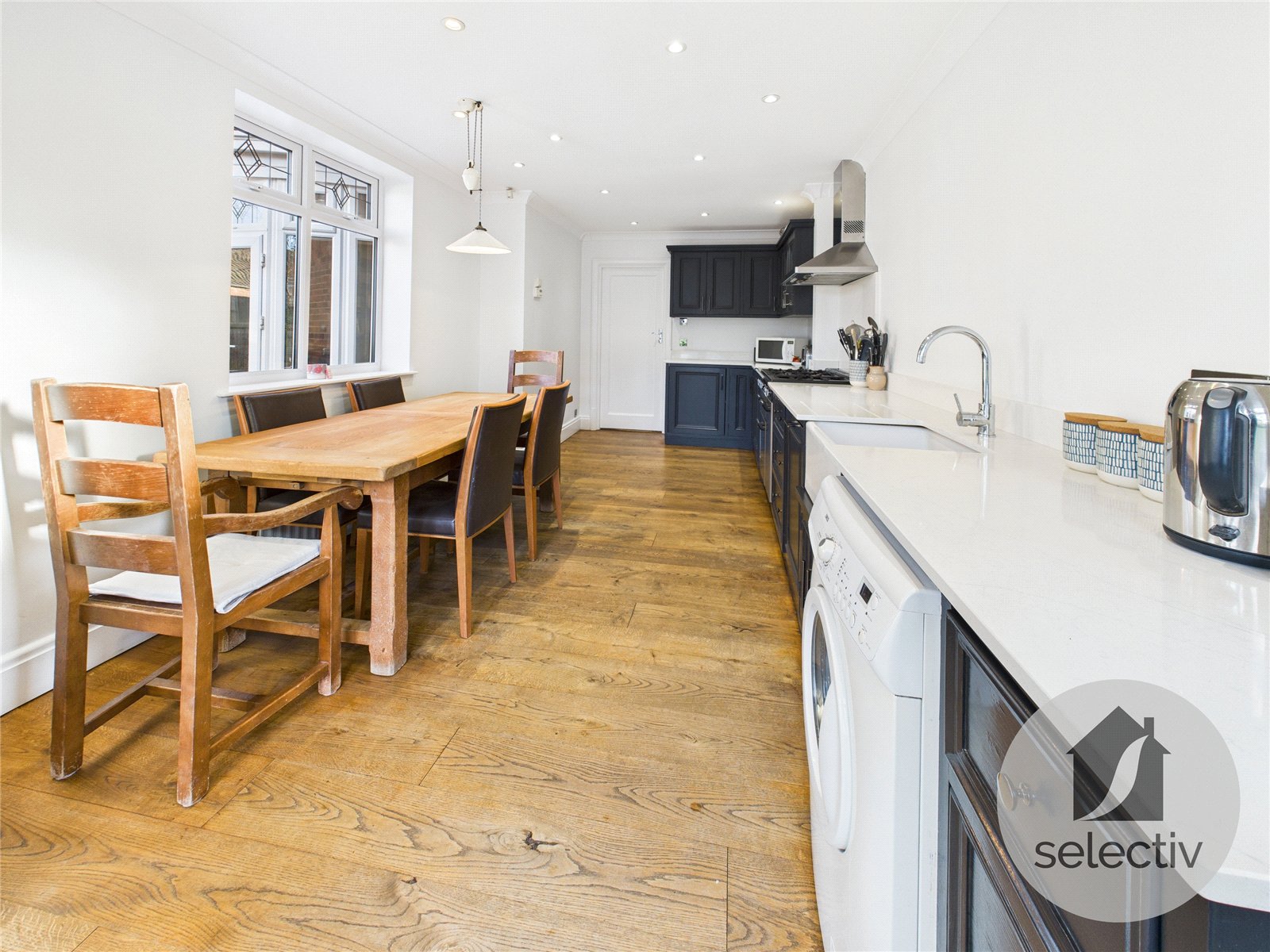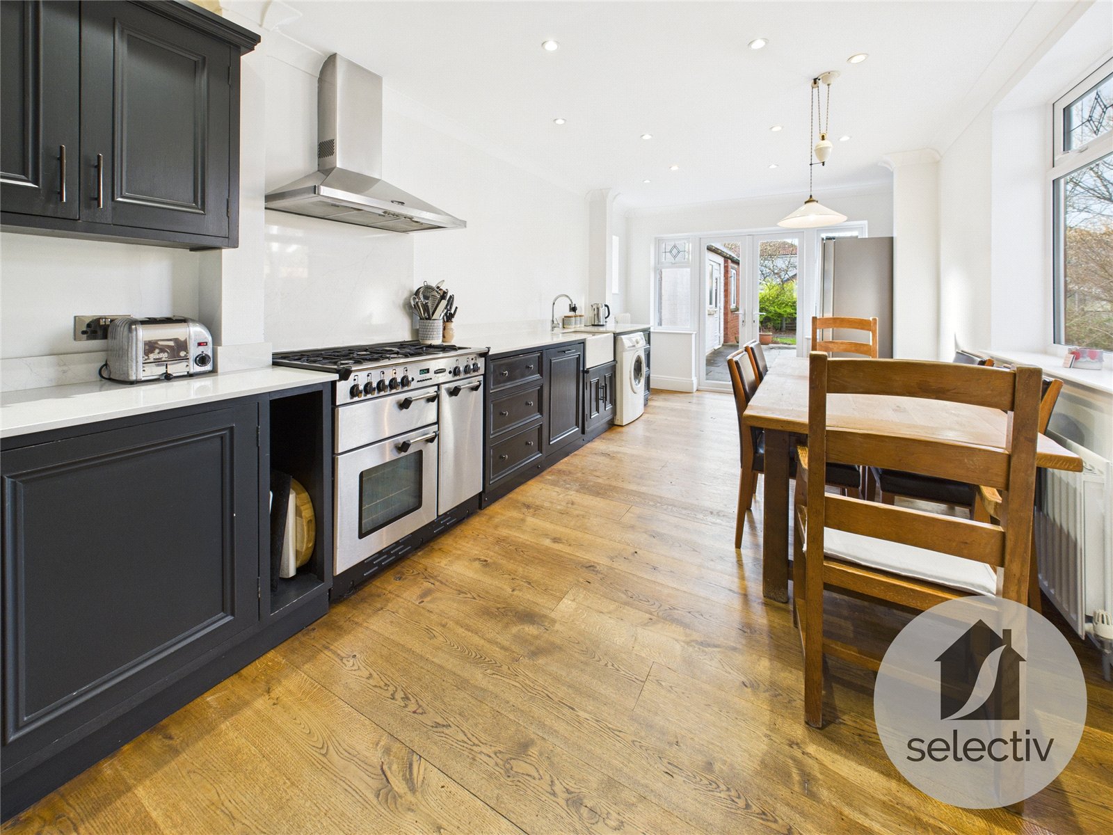 To the rear, the property excels for everyday family life and entertaining. A family room / dining room enjoys French doors opening directly onto the rear garden, while the impressive 21ft kitchen / dining area forms the heart of the home. This space is fitted with a wide and thoughtfully arranged range of contemporary wall and base units, generous worktop space and ample room for dining, again benefitting from French doors opening onto the rear garden to create seamless indoor-outdoor living.