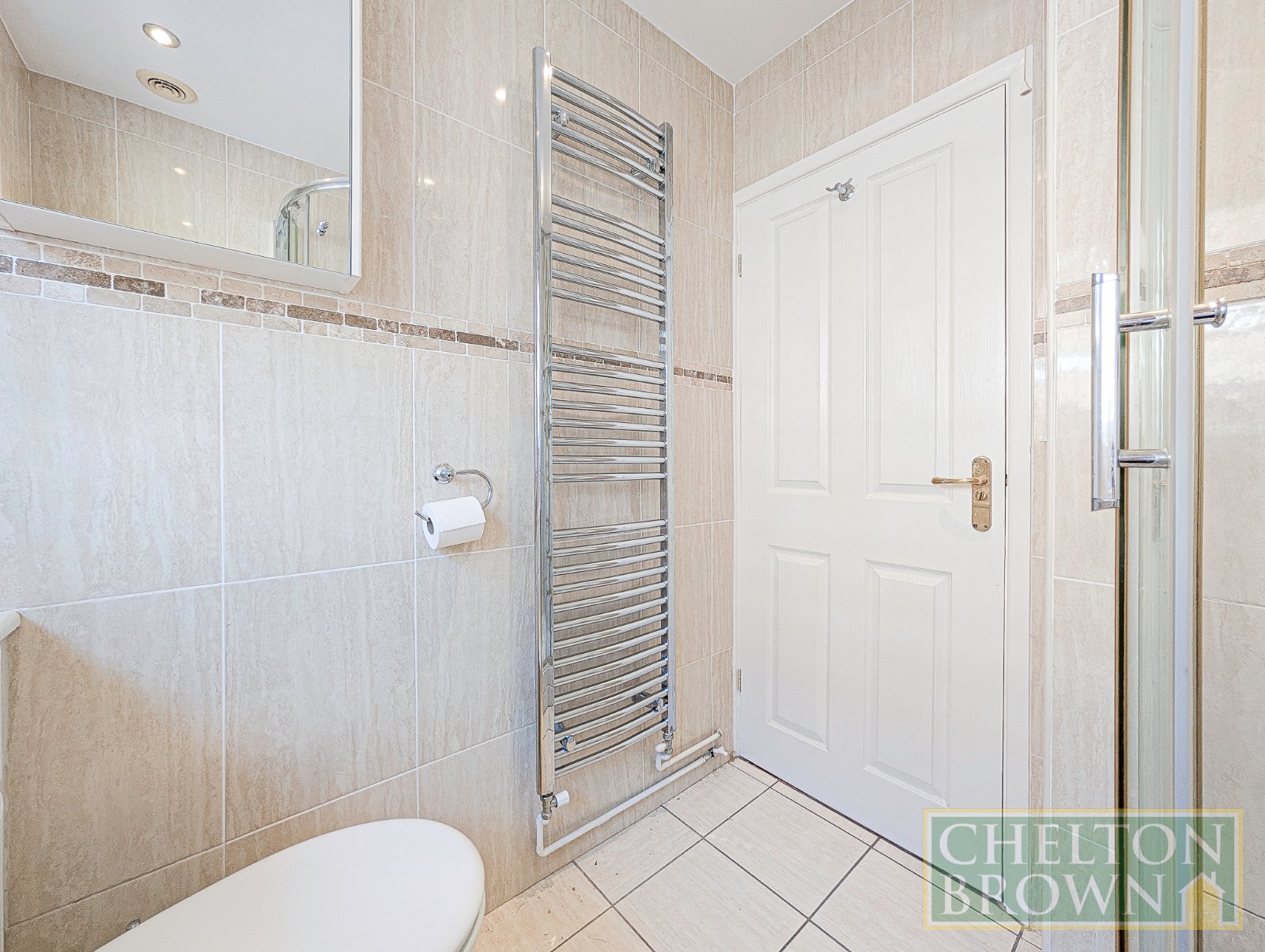 Further along the hallway you'll discover the second double bedroom, a comfortable and well-proportioned room with an outlook onto a private courtyard-style section of the garden. Opposite, the modern shower room is fitted with a large corner shower, wash basin, and WC.
