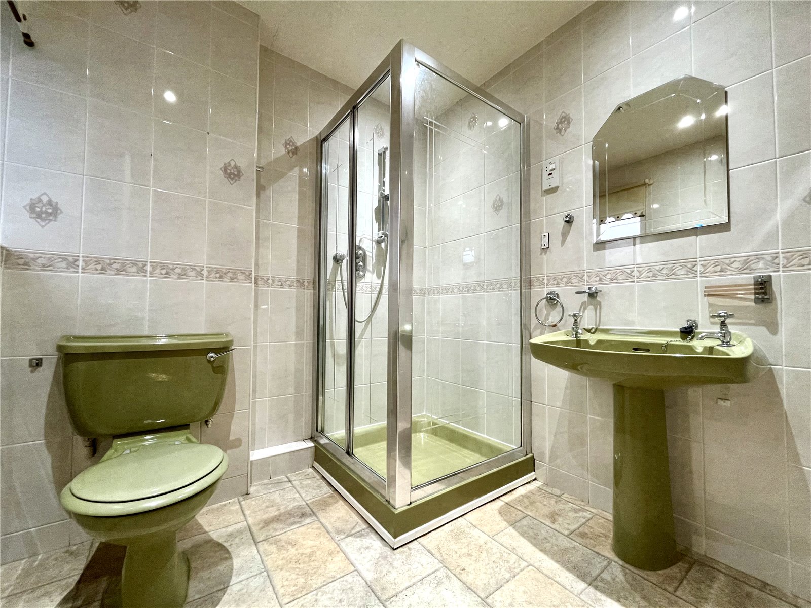 Shower cubicle, pedestal wash hand basin, low level WC and fully tiled walls.