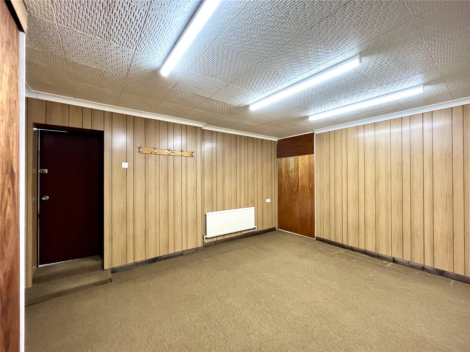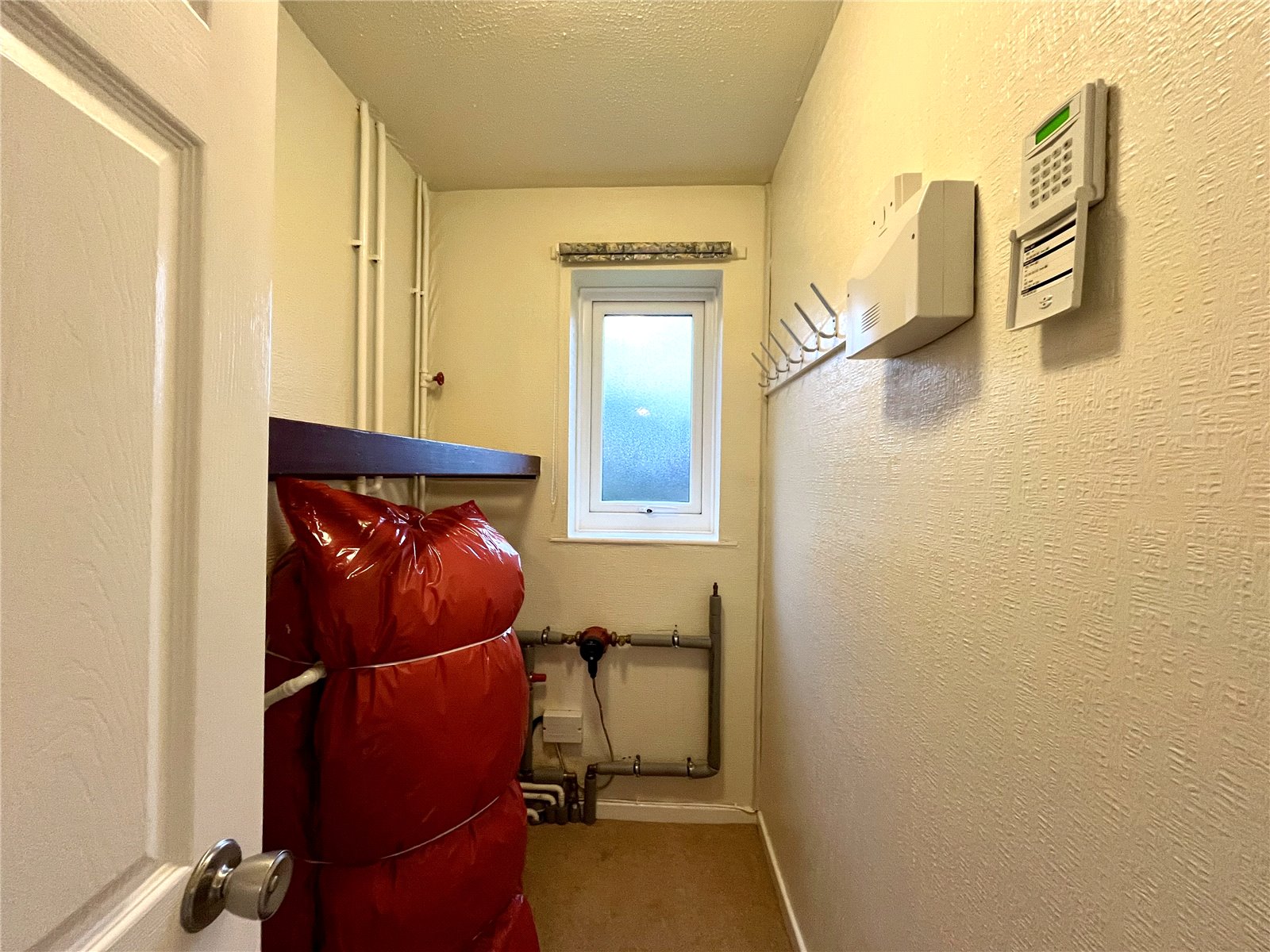 With coat hooks and shelf. Houses the hot water cylinder.