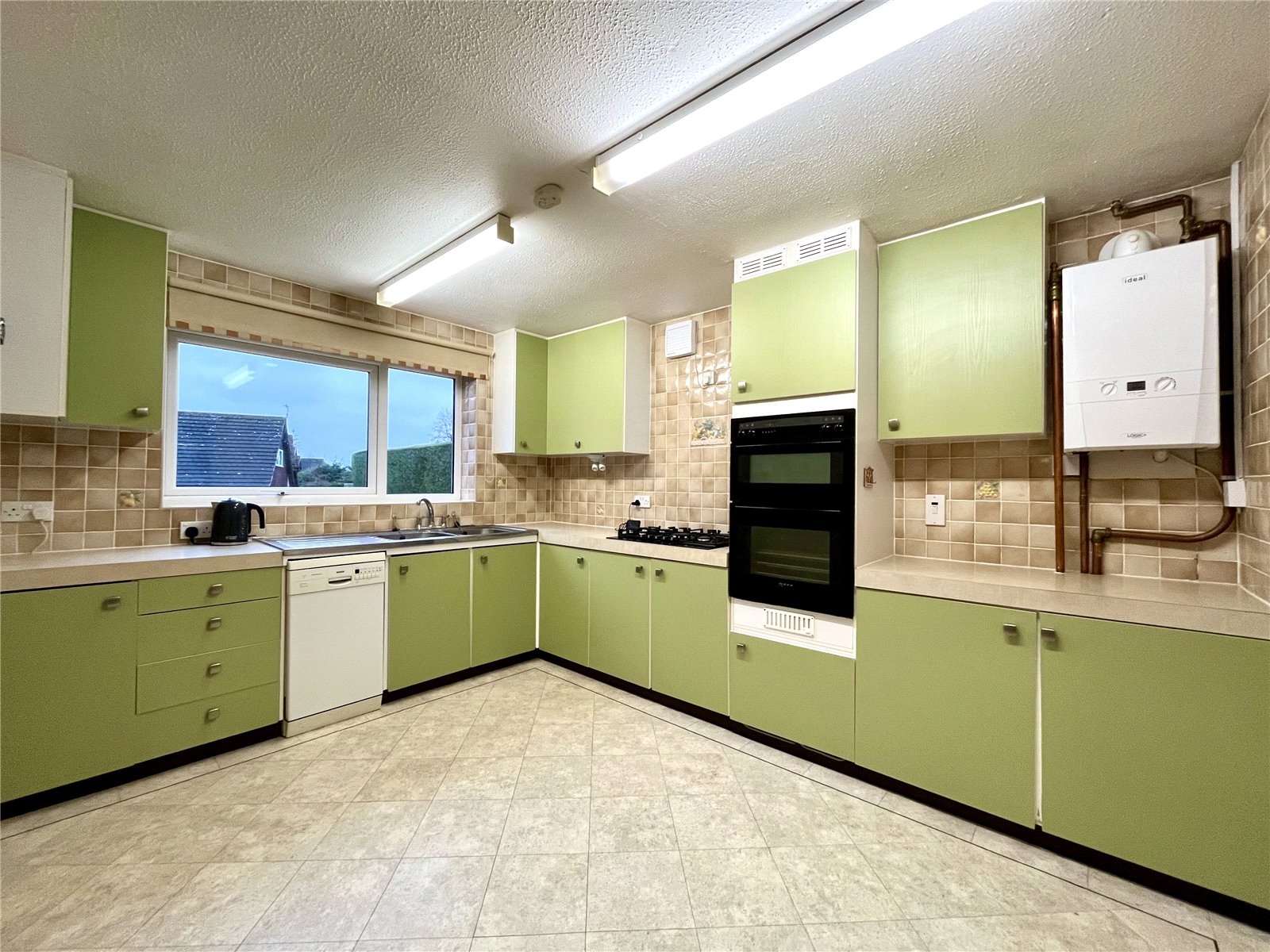 Fitted tall wall and floor cabinets with worktops over incorporating a double stainless steel sink with single drainer and mixer tap over. Five gas hob cooker with built-in double ovens. Fully tiled walls and plumbing for dishwasher. Outlook to the front.