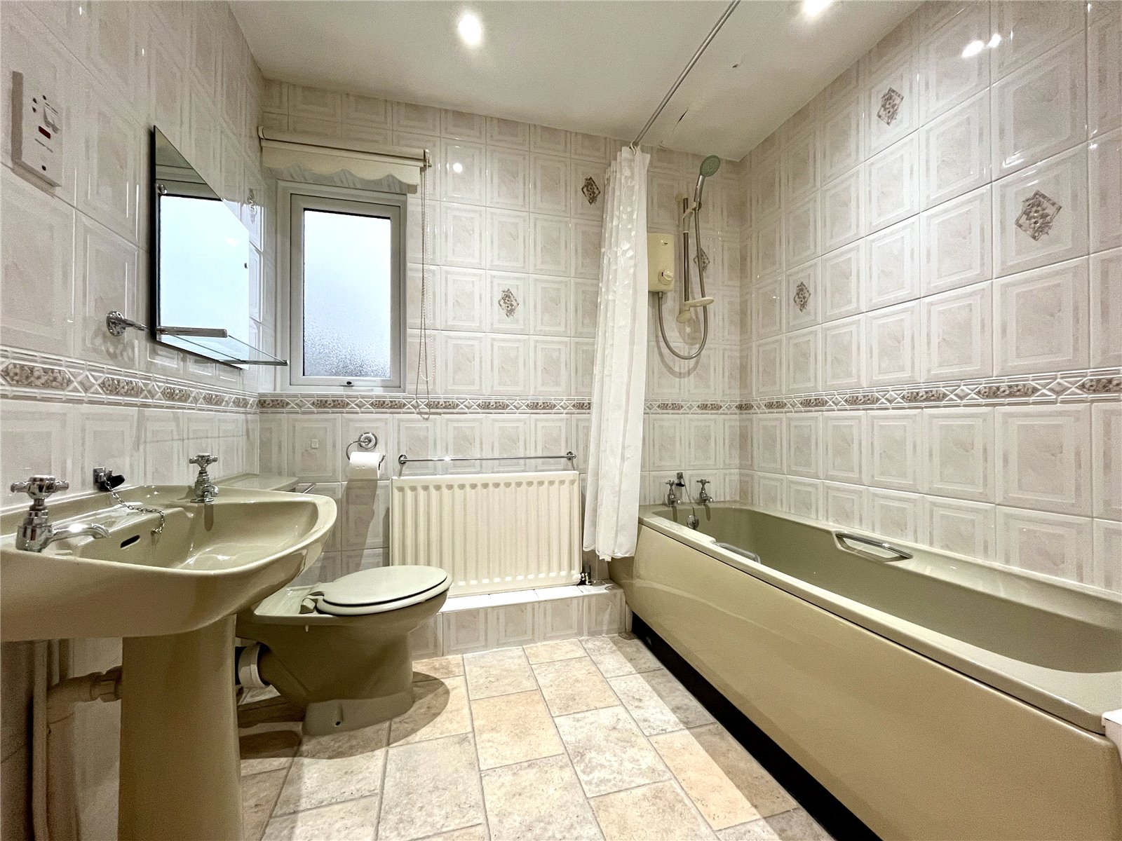 Panelled bath with electric shower over, pedestal wash hand basin, low level WC and fully tiled walls.