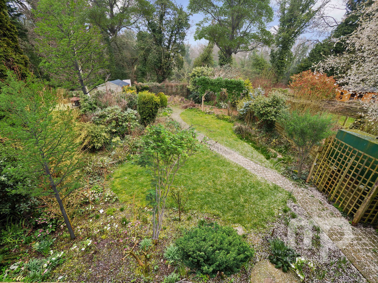 - 75ft well-stocked rear garden backing onto wooded area with two storage sheds