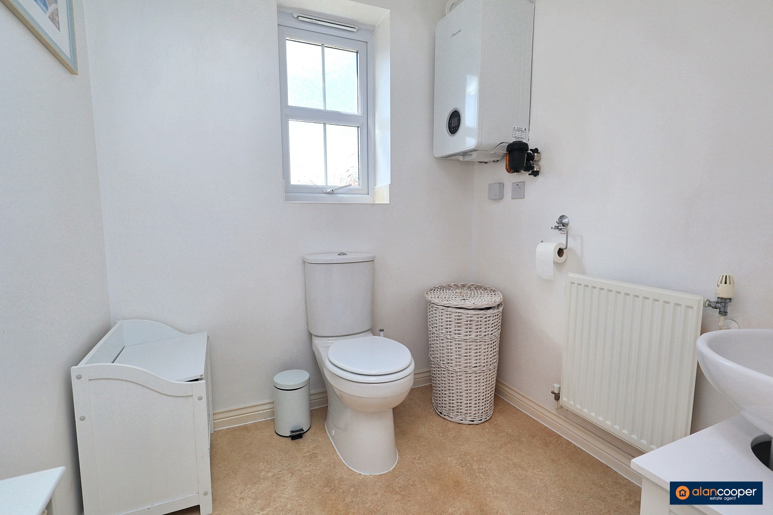 Guests CloakroomHaving a white suite comprising of a wash hand basin and low level WC. Central heating radiator Worcester combi and UPVC sealed unit double glazed window.
