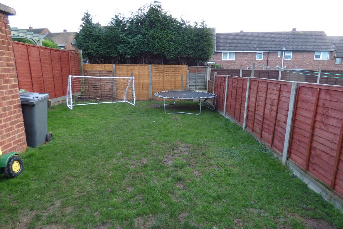 The rear garden has a patio area, lawn and fenced boundaries. Outbuildings and shared tunnel access to the side.