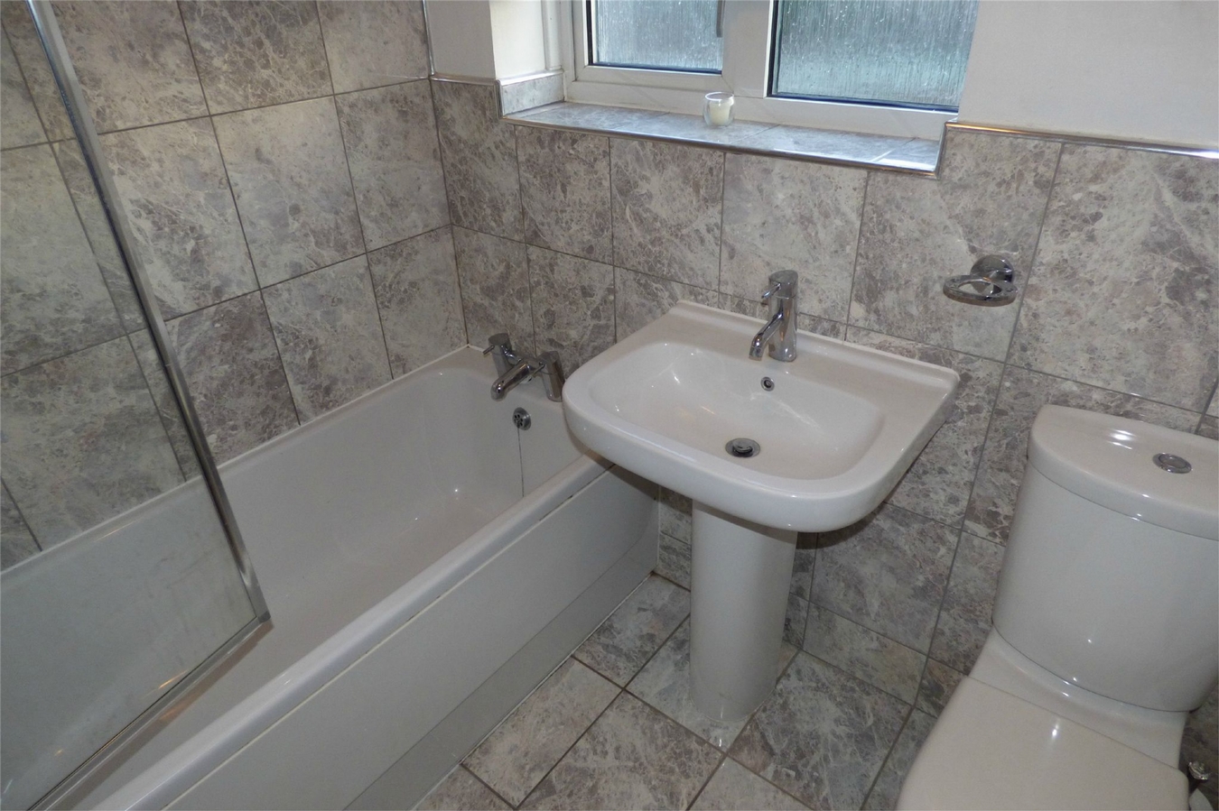 Being part tiled to the walls and having a white suite comprising a panelled bath with shower over, pedestal wash hand basin and low level WC. Central heating radiator and upvc sealed unit double glazed window.