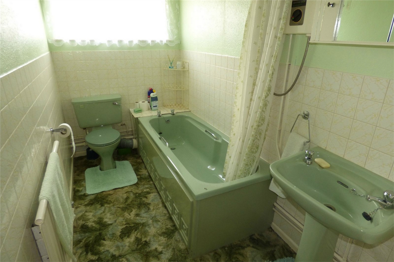 Being half tiled to the walls and having a mint coloured suite comprising a panelled bath with shower over, pedestal wash hand basin and low level WC. Central heating radiator, built-in cupboard and single glazed window.