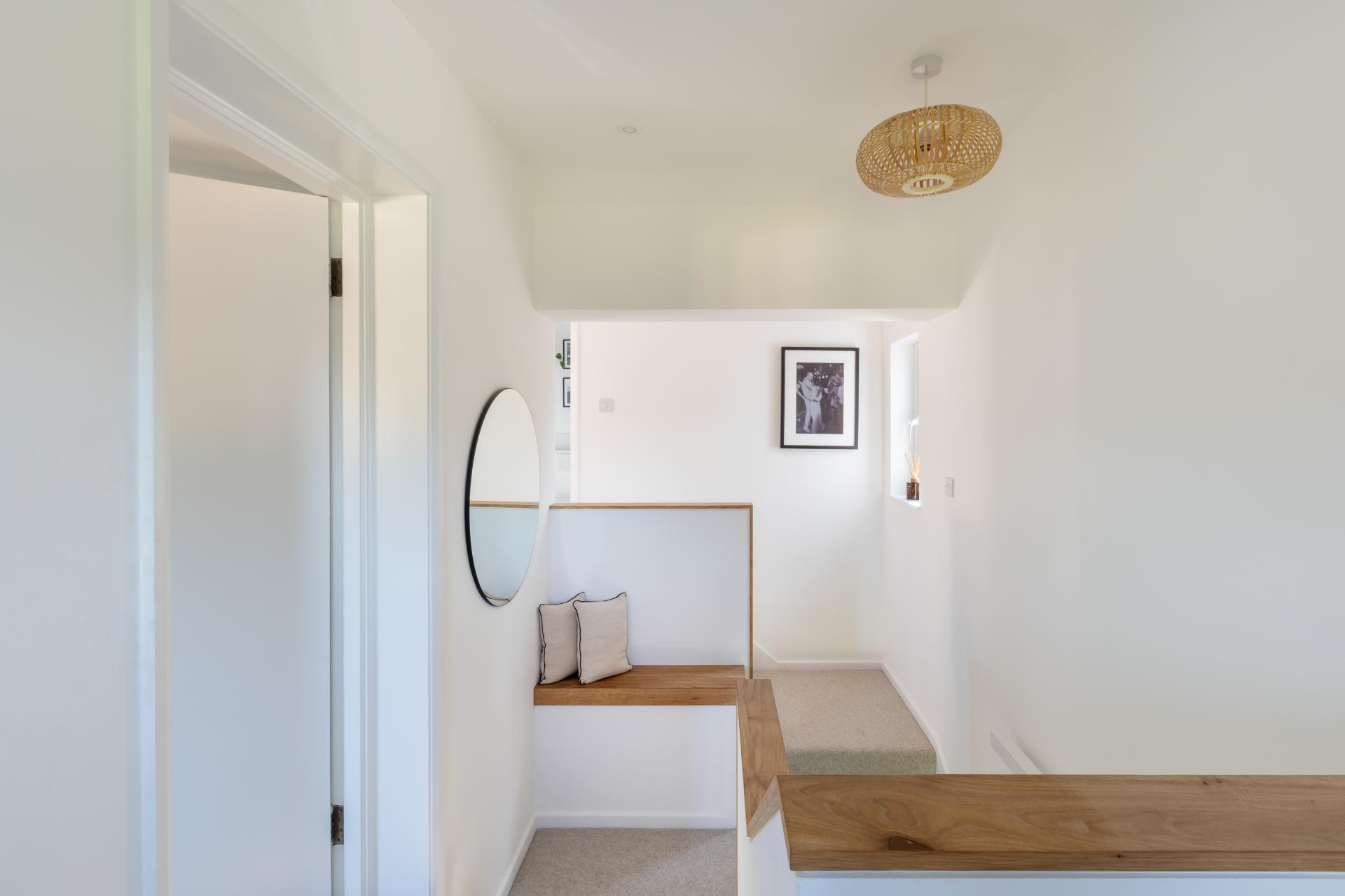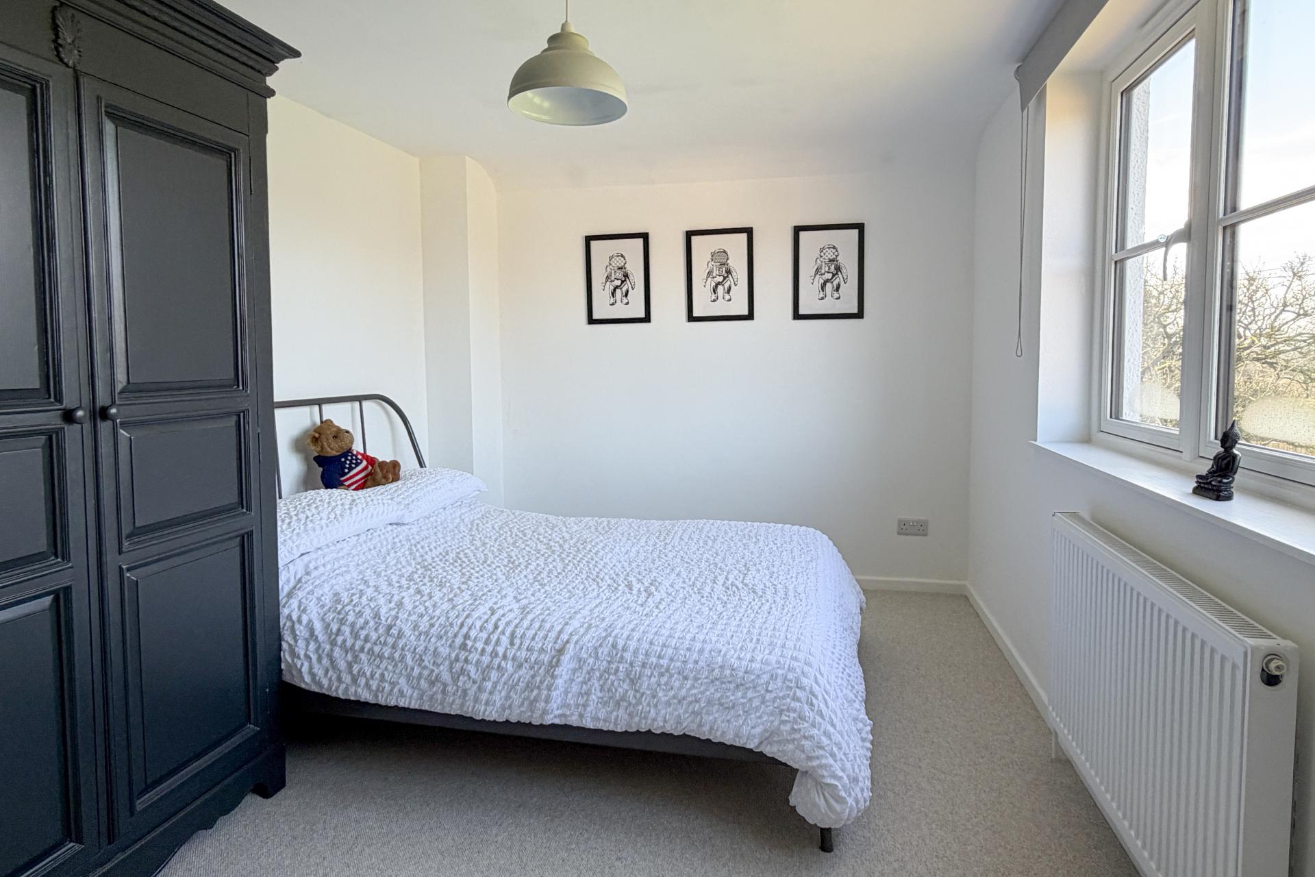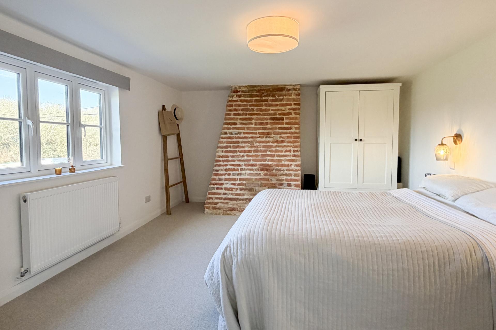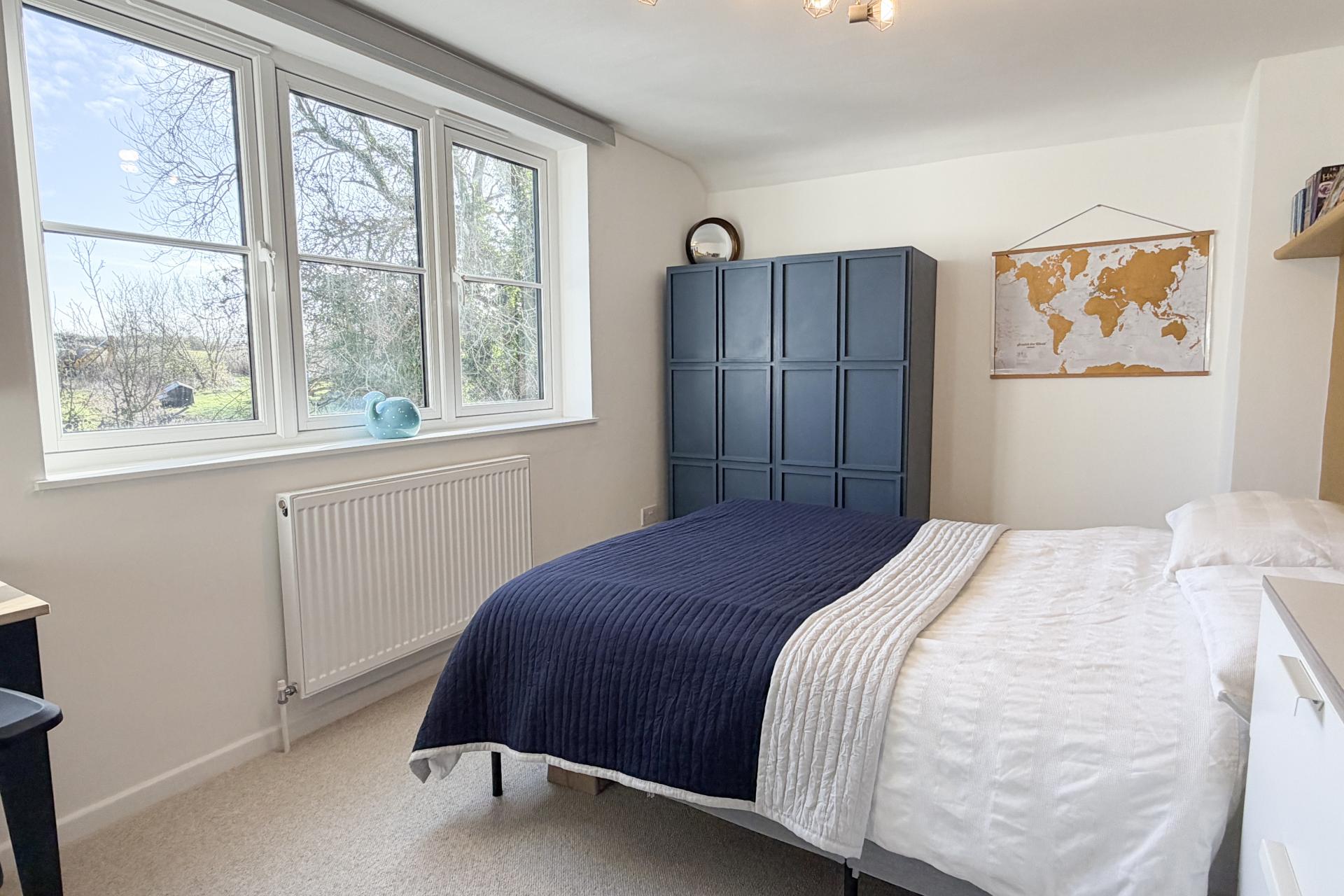 Upstairs, a split landing leads to four generously sized bedrooms, all newly carpeted and well-presented. The main bedroom is positioned at the front of the house and enjoys a lovely open aspect across to woodland. This room is filled with natural light and features a striking original brick chimney breast, creating a warm focal point and adding to the room’s character. A second spacious double bedroom also overlooks the front of the property, offering ample space. The third and fourth bedrooms face the rear, enjoying views over the garden and surrounding countryside. All bedrooms are of comfortable proportions, offering flexibility for family use, working from home, or accommodating guests.