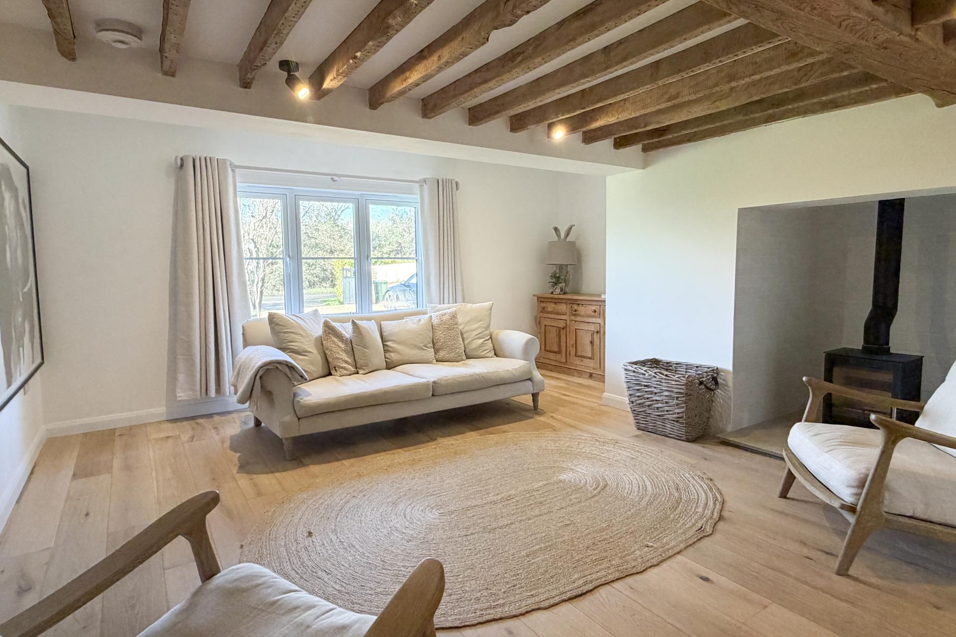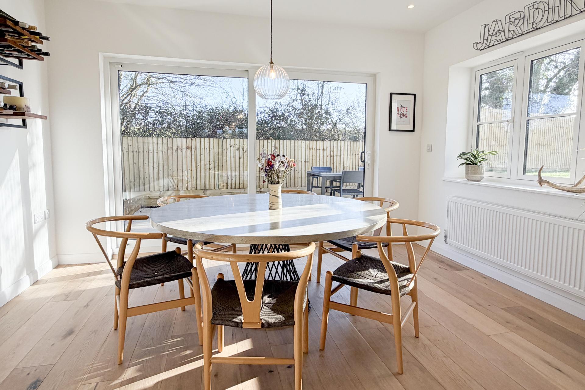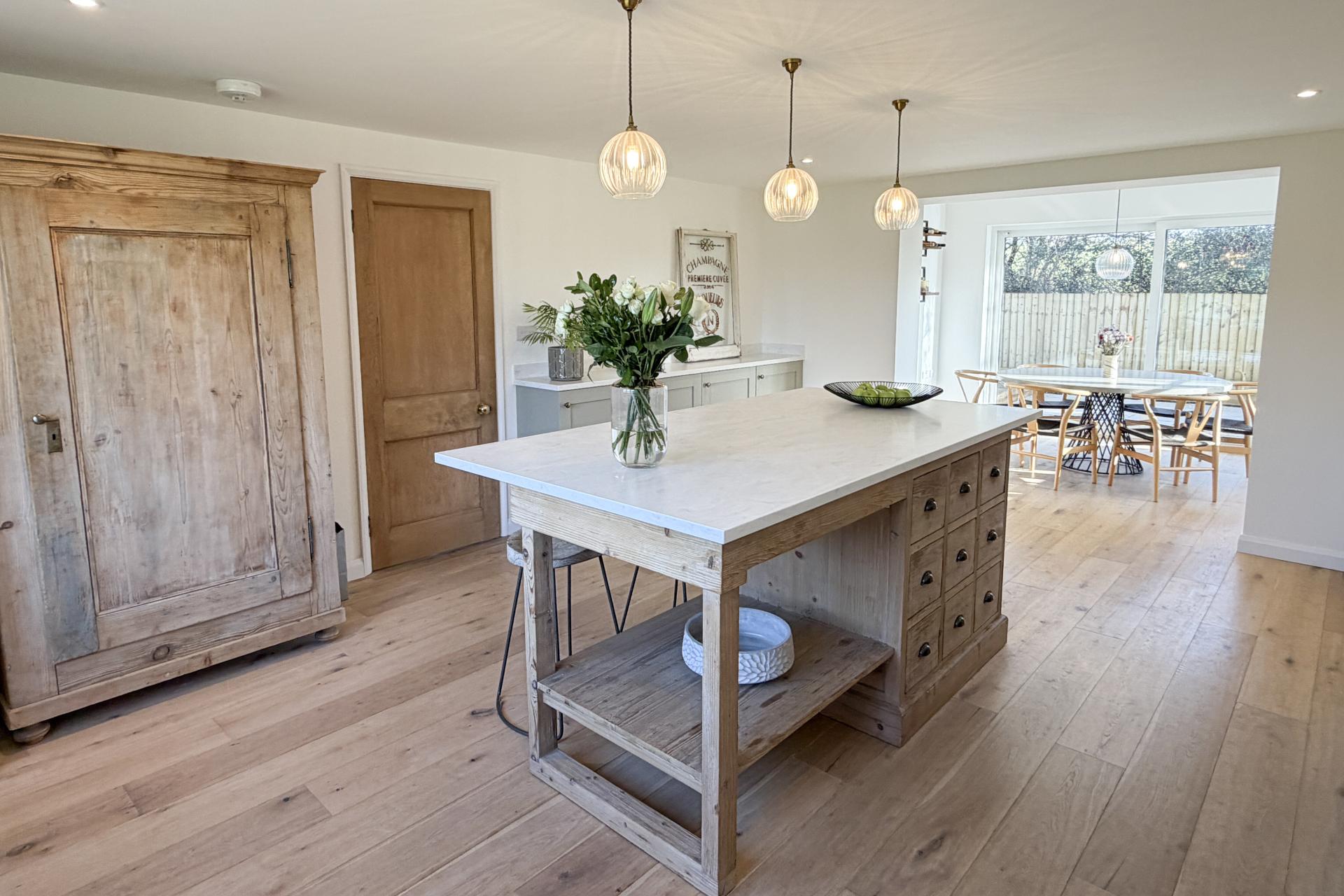 The ground floor features natural oak flooring and stripped pine doors, creating a warm and inviting atmosphere. The sitting room to the front boasts a wood-burning stove and exposed oak beams, leading through to a fifth bedroom or guest suite with a stylish en suite shower room. The kitchen and dining space is a particular highlight, with bespoke cabinetry, a large island unit, Corian worktops, and integrated appliances throughout. Patio doors open onto a wraparound garden and patio, ideal for summer dining. A generous boot room/utility room with tongue and groove panelling and bespoke storage sits to the rear, along with a cloakroom featuring a floating toilet and underfloor heating.