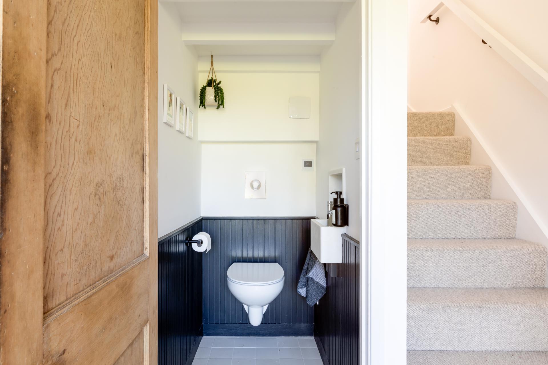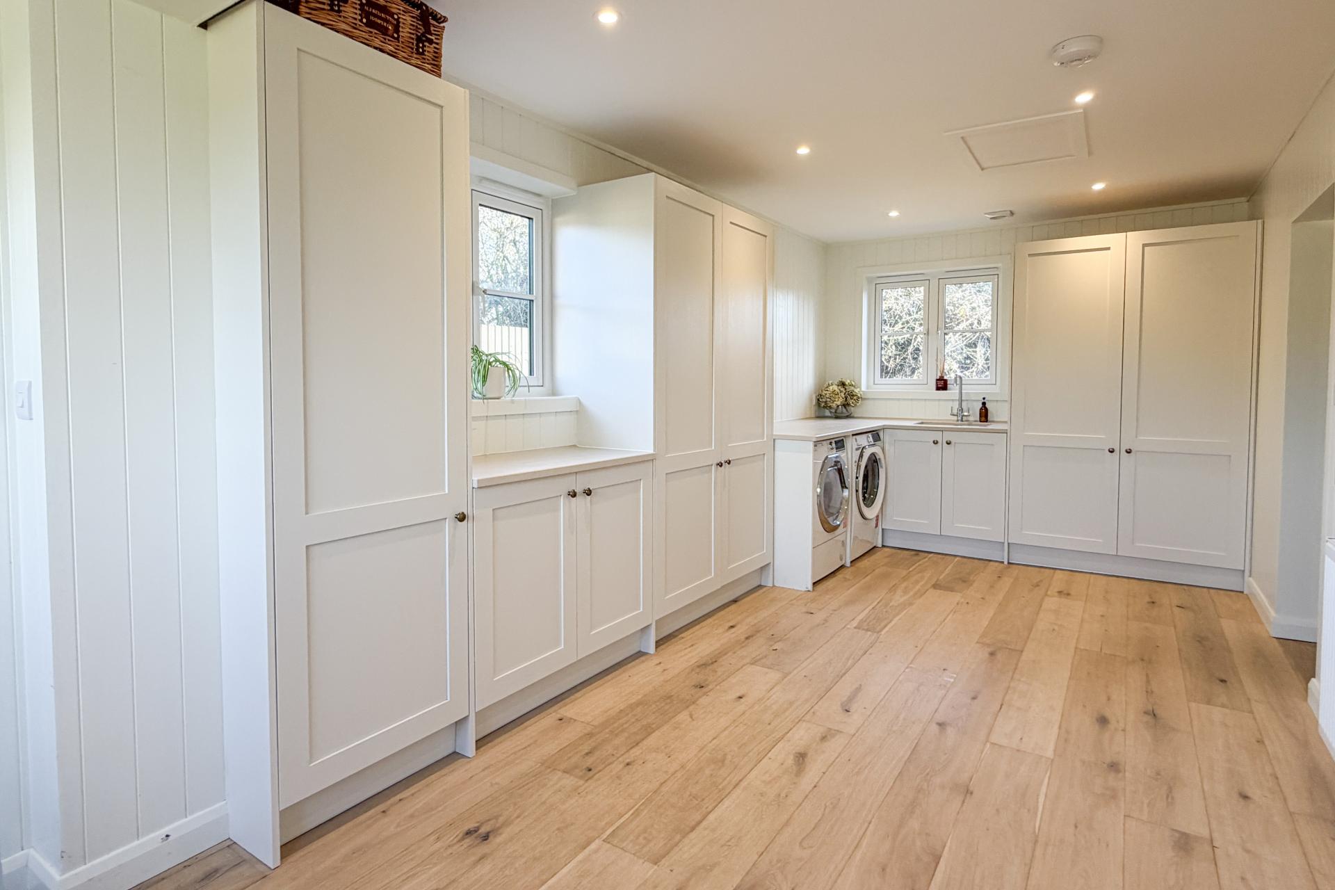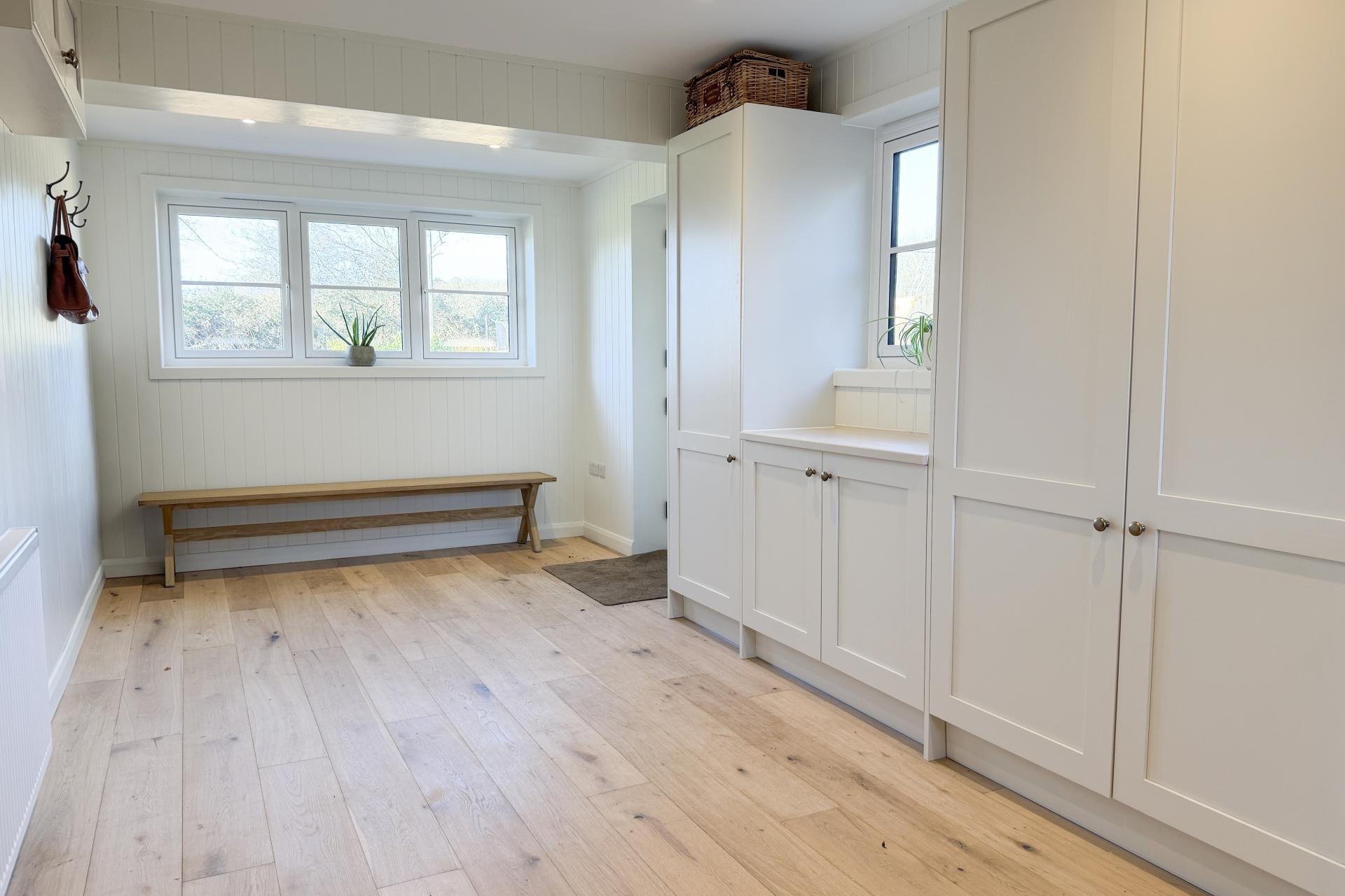 The ground floor features natural oak flooring and stripped pine doors, creating a warm and inviting atmosphere. The sitting room to the front boasts a wood-burning stove and exposed oak beams, leading through to a fifth bedroom or guest suite with a stylish en suite shower room. The kitchen and dining space is a particular highlight, with bespoke cabinetry, a large island unit, Corian worktops, and integrated appliances throughout. Patio doors open onto a wraparound garden and patio, ideal for summer dining. A generous boot room/utility room with tongue and groove panelling and bespoke storage sits to the rear, along with a cloakroom featuring a floating toilet and underfloor heating.