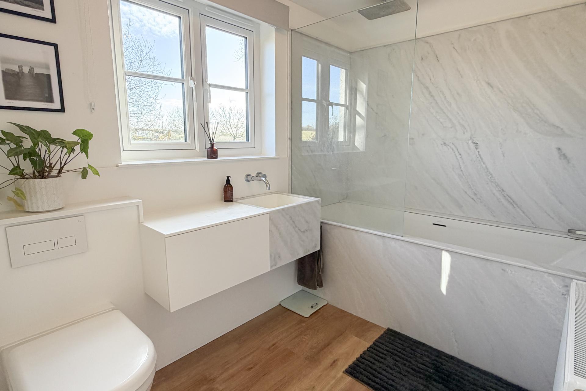 The family bathroom is beautifully finished, featuring a white suite with a large, panelled bath, WC, and basin. A rear-facing window brings in natural light and frames a pleasant view over the garden.