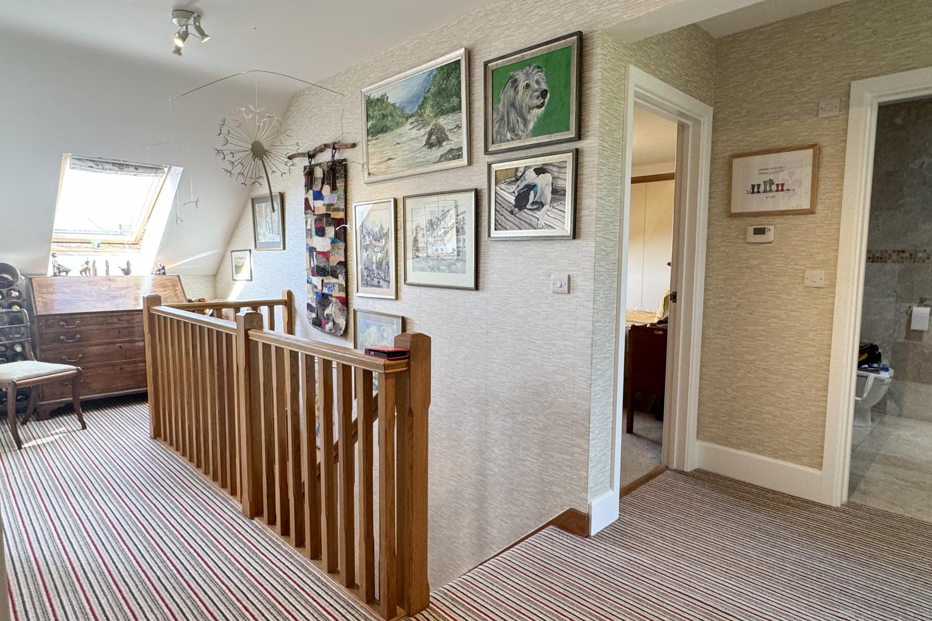 Upstairs, a spacious landing with room for a desk leads to four well-proportioned bedrooms. The principal suite features bifold doors to a private balcony with far-reaching views, built-in wardrobes, and a luxurious en-suite shower room finished in marble-effect tiling. Bedroom two is front facing with bespoke wardrobes; bedrooms three and four enjoy views and flexible layout options. A stylish family bathroom completes the upper floor.