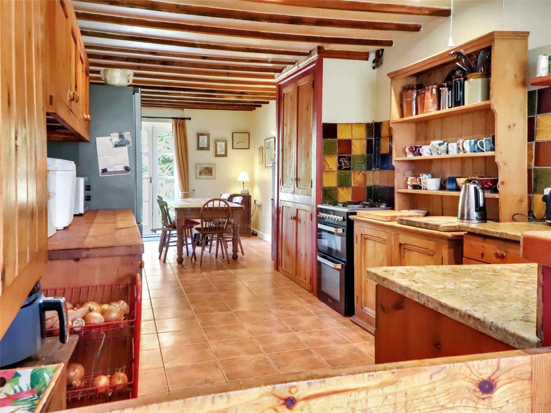Beyond the front door is a fine 23' beamed sitting room which has an impressive part stone fireplace with bread oven and contemporary styled multi fuel stove sat upon a tiled hearth. Leading off is a 25' double aspect kitchen/breakfast room with tiled floor and doors to the front terrace, having an extensive range of cupboards and drawers with associated work surfacing off set by wall tiles by the artist Clive Bowen. The boot room is found at the far end down a couple of steps and is an ideal place for those inclement days giving somewhere for the clothes and footwear to dry out naturally. From here doors lead both to the side of the house where there is a gravel garden and another to the utility room having appliance space, wash hand basin and WC.