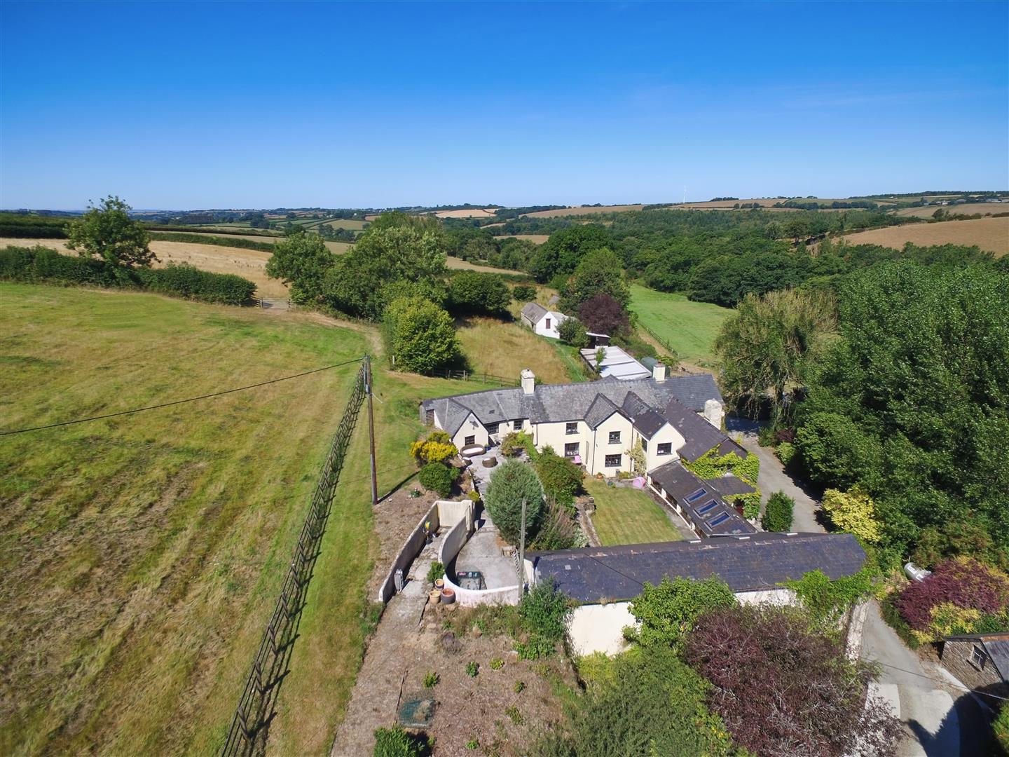 House - This versatile and characterful house provides flexible and comfortable family living, with the potential to easily accommodate multiple generations or provide an income. The accommodation benefits from gas central heating, wood burning stoves and some double glazed window and briefly comprises; Entrance hall, boot room and seating area, kitchen / dining room with electric range cooker and Rayburn. Dining room, a dual aspect room with views over the land and surrounding countryside. Sitting room with inglenook fireplaces to either end with woodburning stoves and character beam ceilings. Study, sitting room / annexe bedroom, en suite shower room and built in wardrobes. Indoor heated swimming pool, gym area, sauna, changing room with W/C and wash hand basin. From the swimming pool double bi-fold doors open onto a patio and lawned terrace. Utility / pool pump room. On the first floor: a spacious landing providing a large seating area, master bedroom with door leading to the sun deck, en suite with sunken bath, shower cubicle, wash handbasin, toilet and bidet. Bedroom 2, a dual aspect room with views over the land and surrounding countryside beyond. Family bathroom, double ended bath, shower cubicle, wash handbasin, W/C and bidet. Bedroom 3 suite comprising: dressing room, sitting / laundry room, double bedroom, dressing room / study and en suite shower room with wash hand basin and W/C. Bedroom 4 with window overlooking the garden.