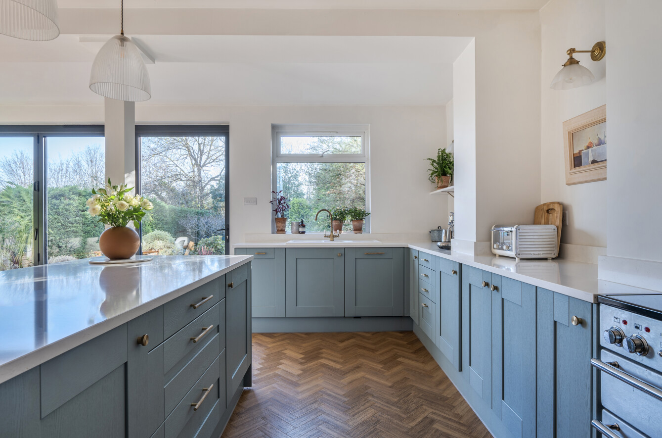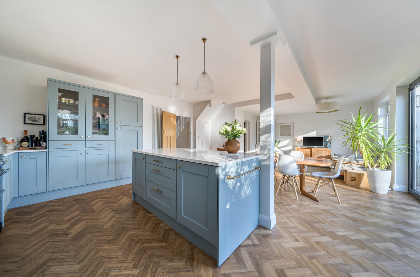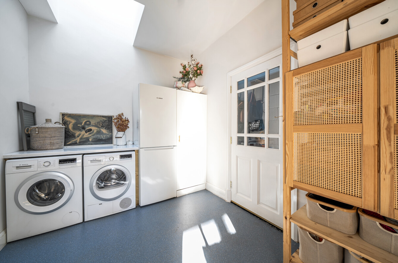 The fully fitted kitchen offers ample storage space, central island, quartz worktops, range cooker and integrated appliances. Floor to ceiling bi-fold doors flood this area with natural light and provide a seamless connection between inside and out, and Amtico flooring flows throughout the downstairs accommodation. Adjacent to the kitchen is a utility area with sky lantern, ample storage and access to garage storage.