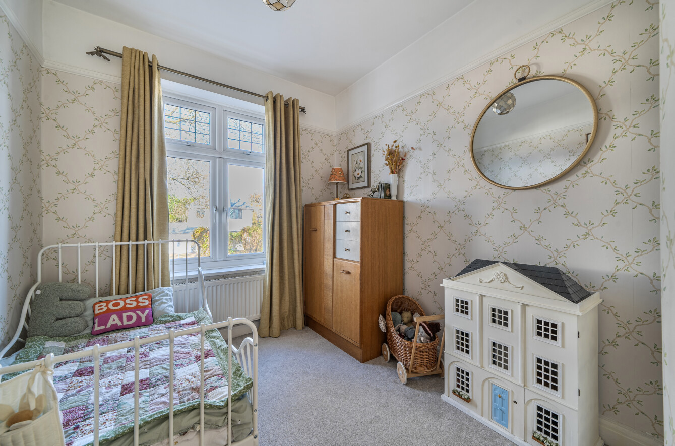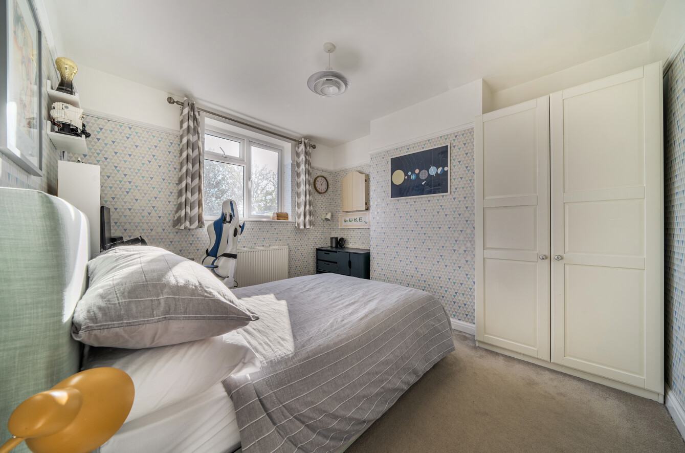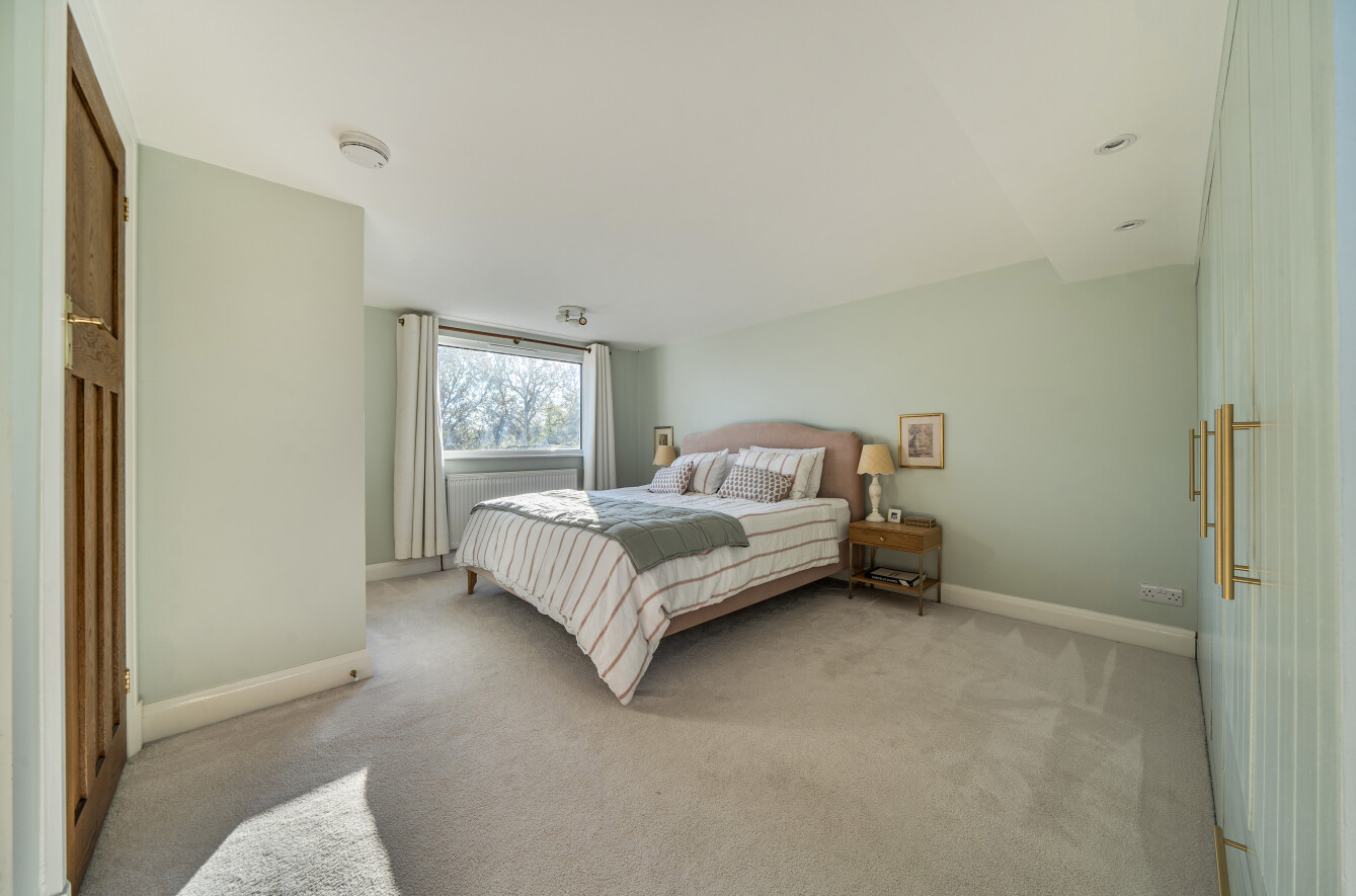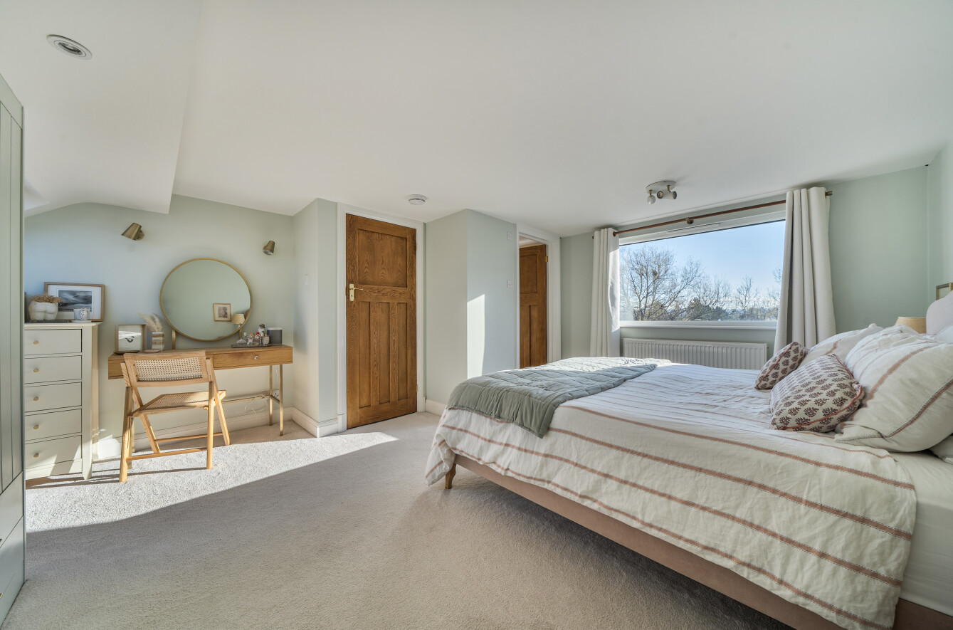 The top floor boasts a master suite overlooking the south facing rear garden, floor to ceiling bespoke fitted wardrobes, eaves storage and a modern en-suite shower. This room provides the perfect oasis away from modern family living.